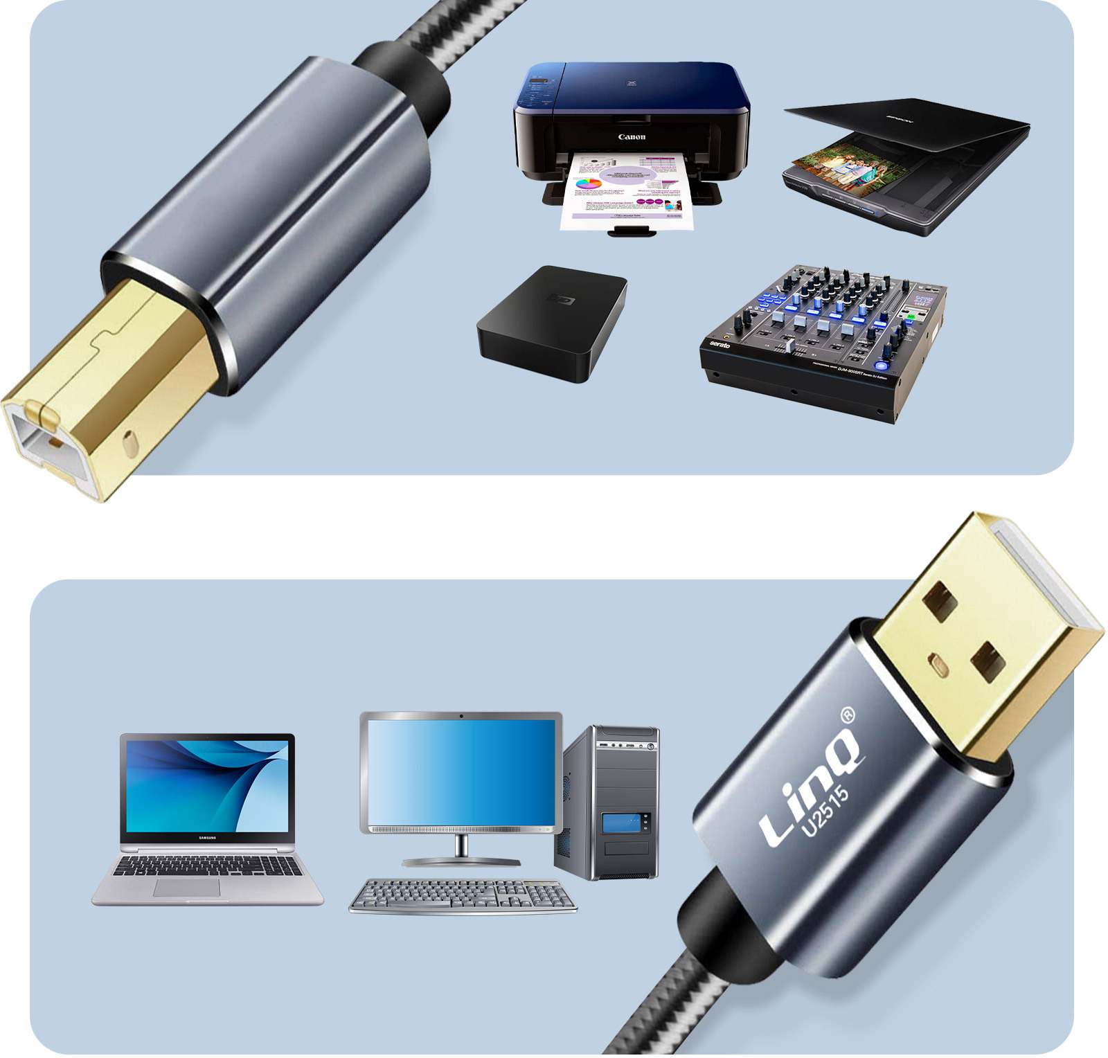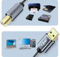 Cable USB-A 2.0 macho a USB-B 2.0 macho de LinQ. Transferencia de datos rápida y sencilla con una conexión estable y sin interferencias. Compatible con ordenadores, teclados, ratones, impresoras, escáneres, etc. De nailon trenzado. Longitud 1,5 m. • Características y Puntos fuertes: Cable USB 2.0 tipo A macho a USB 2.0 tipo B macho de LinQ. Compatible con todos los dispositivos equipados con conectividad USB 2.0 Tipo B. Perfecto para conectar tu dispositivo (impresora, disco duro externo, escáner, mezclador, sintetizador, etc.) al ordenador. Garantiza una transferencia de datos perfecta con soporte rápido (alta velocidad: transferencia de hasta 480 Mbit/s)