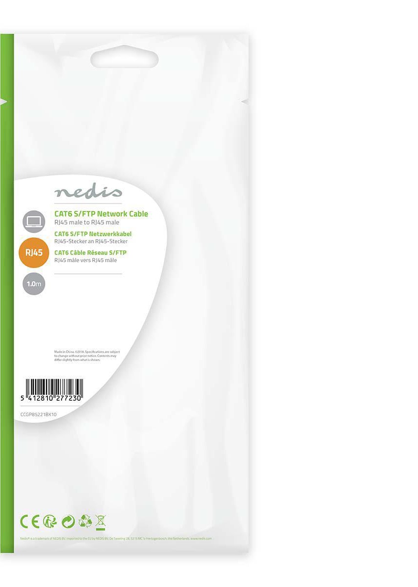 Nedis CCGP85221BK10. Longitud de cable: 1 m, Cable estándar: Cat6, Blindaje de cable: S/FTP (S-STP), Conector 1: RJ-45, Conector 2: RJ-45, Género del conector: Macho, Contactos del conector chapado: Oro, Velocidad de transferencia de datos: 1000 Mbit/s, Color del cable: Negro