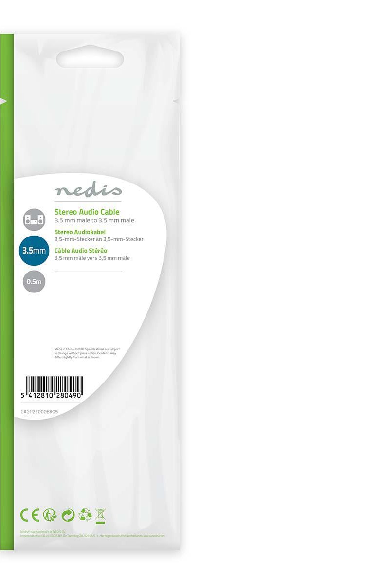 Nedis CAGP22000BK05. Conector 1: 3,5mm, Género del conector 1: Macho, Conector 2: 3,5mm, Género del conector 2: Macho, Material del cable: Acero revestido de cobre (CCS, Copper-clad steel), Contactos del conector chapado: Níquel, Longitud de cable: 0,5 m, Color del producto: Negro