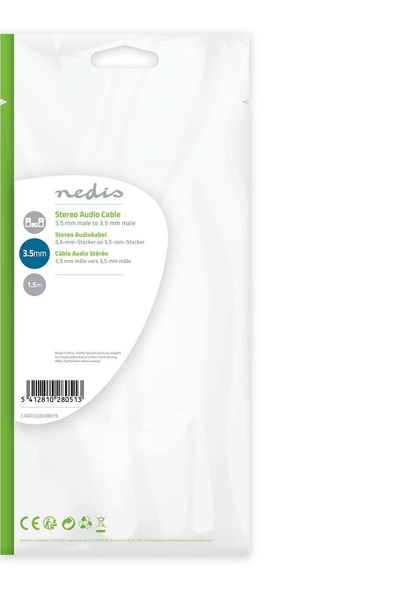 Nedis CAGP22000BK15. Conector 1: 3,5mm, Género del conector 1: Macho, Conector 2: 3,5mm, Género del conector 2: Macho, Material del cable: Acero revestido de cobre (CCS, Copper-clad steel), Contactos del conector chapado: Níquel, Longitud de cable: 1,5 m, Color del producto: Negro
