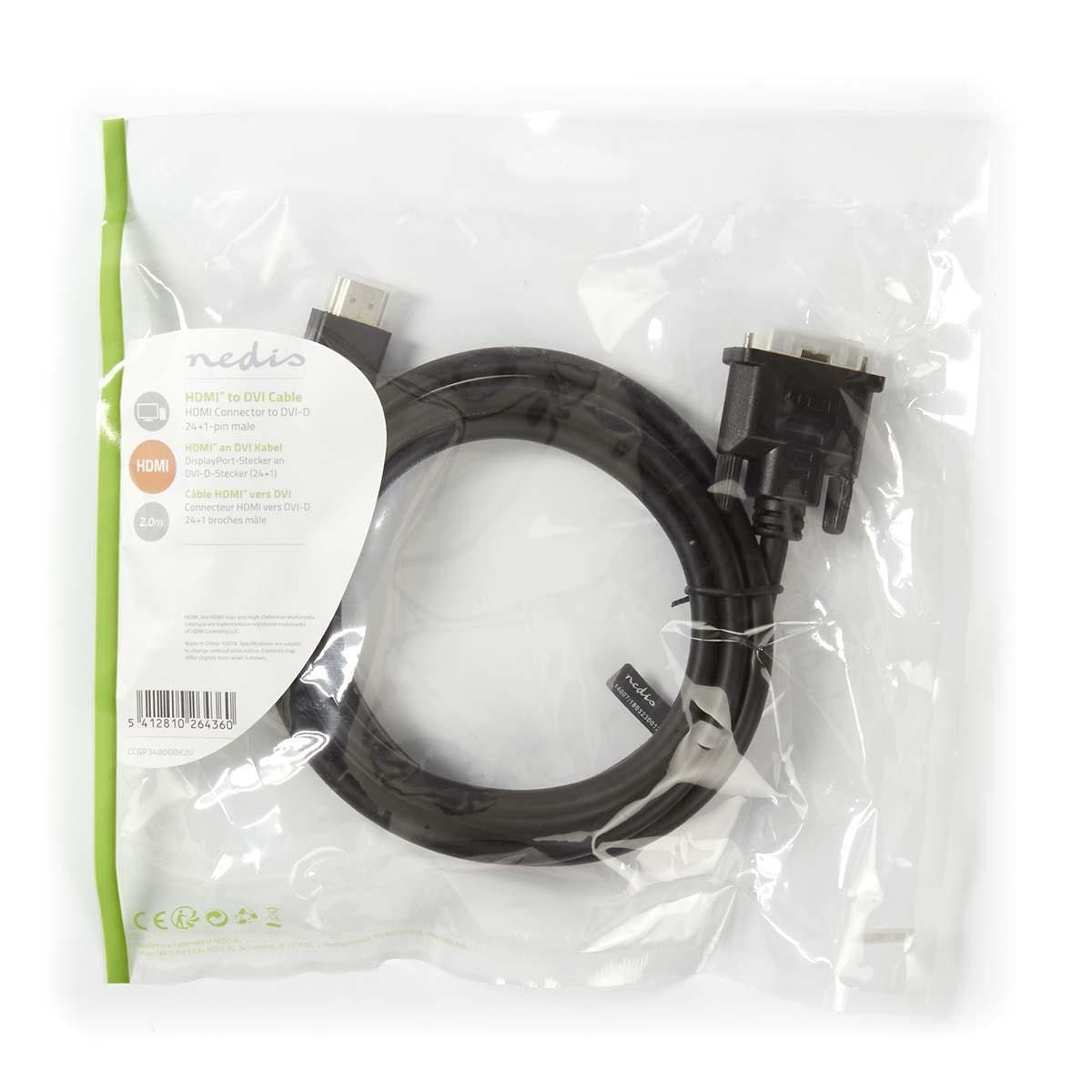 Nedis CCGP34800BK20. Longitud de cable: 2 m, Conector 1: HDMI, Conector 2: DVI-D 24+1-Pin. Cantidad por paquete: 1 pieza(s), Tipo de embalaje: Bolsa de plástico. Diámetro de cable: 7,3 mm