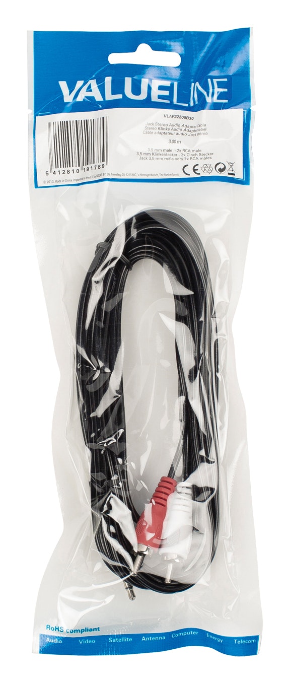 Valueline VLAP22200B30. Conector 1: 2 x RCA, Género del conector 1: Macho, Conector 2: 3,5mm, Género del conector 2: Macho, Longitud de cable: 3 m, Color del producto: Negro, Rojo, Blanco