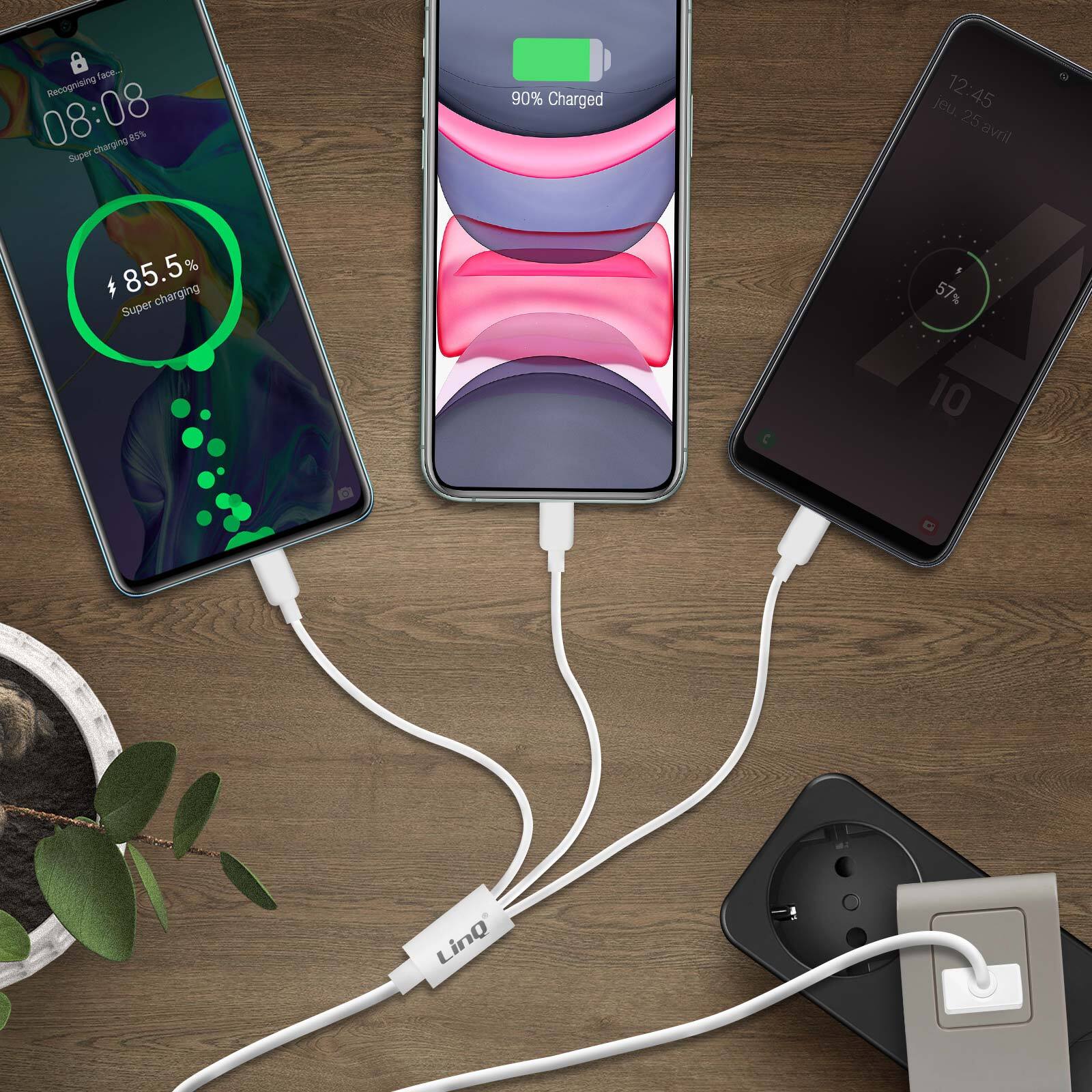 Cable de carga USB LinQ 3 en 1 Lightning / Micro-USB / USB Tipo C. Carga hasta 3 dispositivos al mismo tiempo. Cable robusto con una longitud de 1,2 m. (No ofrece función de sincronización de datos).
