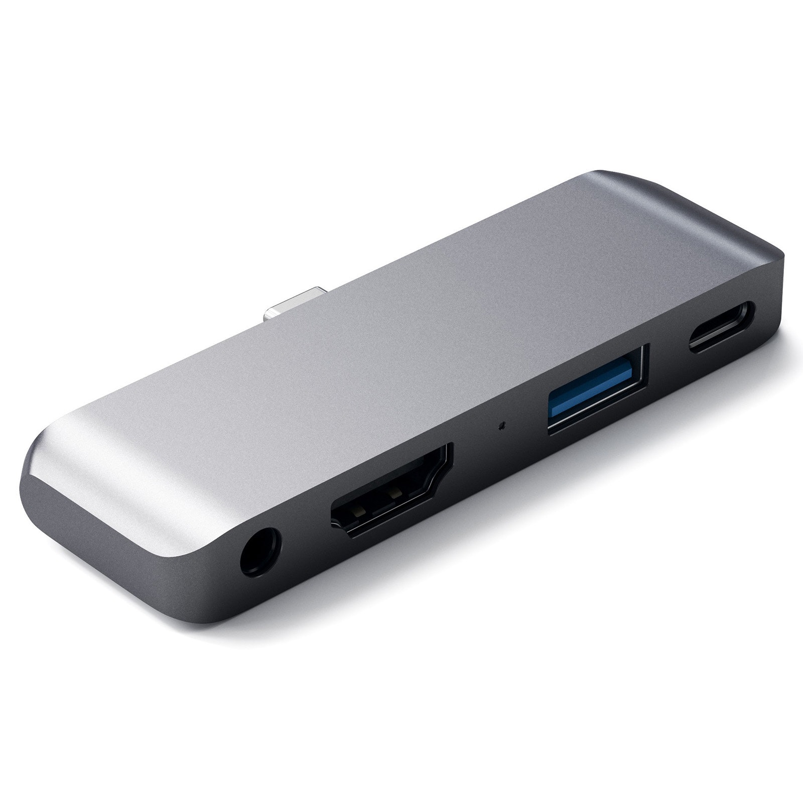 HUB USB-C 4 en 1 de Satechi para dispositivos con puerto USB tipo C. 1 puerto USB 3.0 + 1 puerto USB tipo C + 1 puerto HDMI 4K + 1 conector de 3,5 mm. Plug & play: no se necesita configuración. Diseño compacto y sólido de aluminio.