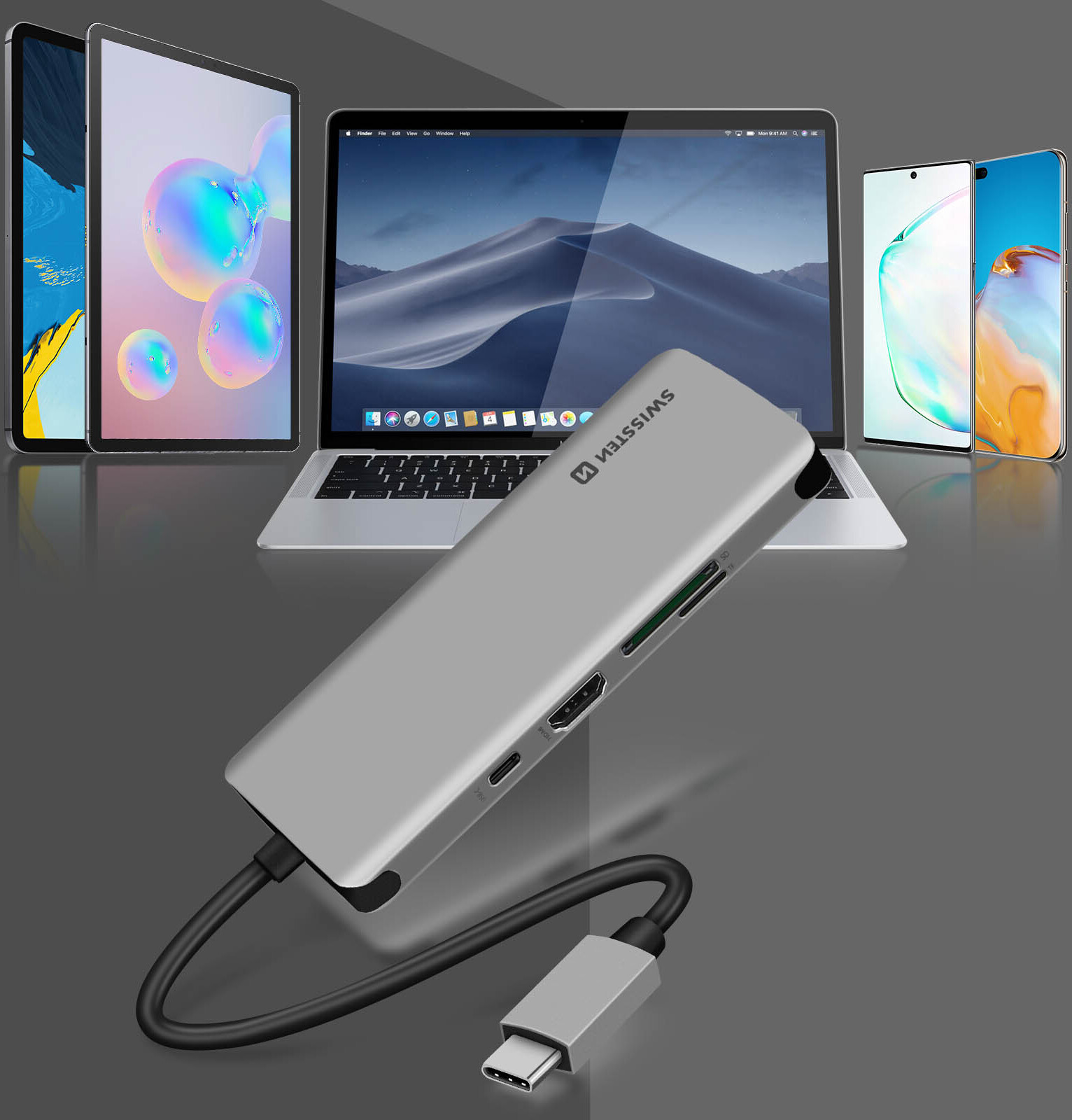 HUB concentrador USB-C 8 en 1 de Swissten. Compatible con PC, smartphone, tablet y iPad USB tipo C. Multipuertos: 3x USB, 1x USB-C Power Delivery 100W, 1x HDMI 4K, 1x Ethernet y 1x Lector SD/Micro-SD. Transferencia de datos a 5 gb/s. Diseño compacto.