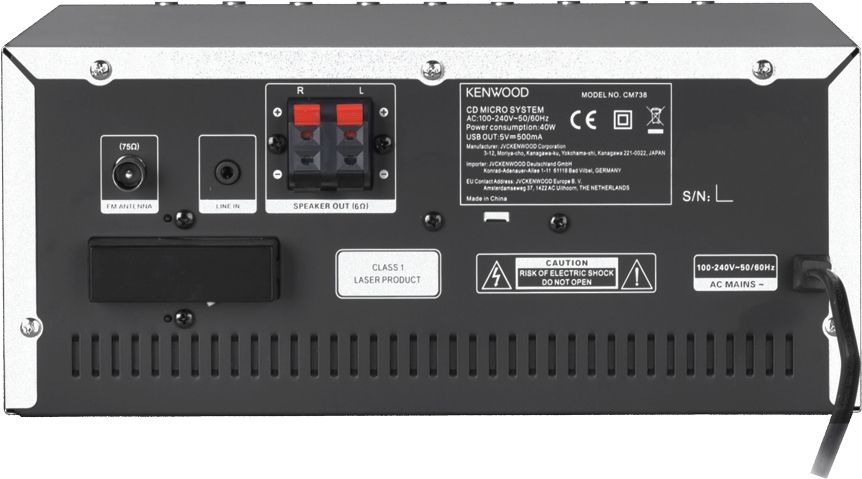 Kenwood M-9000S. Tipo: Minicadena de música para uso doméstico, Color del producto: Plata, Número de discos ópticos: 1 discos. Potencia estimada RMS: 50 W, Tipo de altavoces: De 2 vías, Obstrucción: 6 O. Bandas de radio soportadas: DAB+, FM, Banda FM: 87,5 - 108 MHz, Servicios de radio por internet soportados: Spotify. Tipo de visualizador: TFT, Color de luz de fondo: Multicolor. Formatos de audio soportados: CBR, MP3, MP3 VBR
