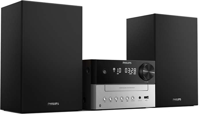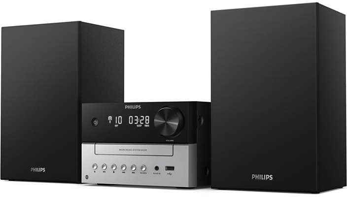 Philips TAM3205. Tipo: Microcadena de música para uso doméstico, Color del producto: Negro, Plata. Potencia estimada RMS: 18 W, Diámetro del woofer: 7,62 cm. Bandas de radio soportadas: FM, Tipo de sintonizador: Analógica. Tipo de visualizador: LED. alcance Bluetooth: 10 m