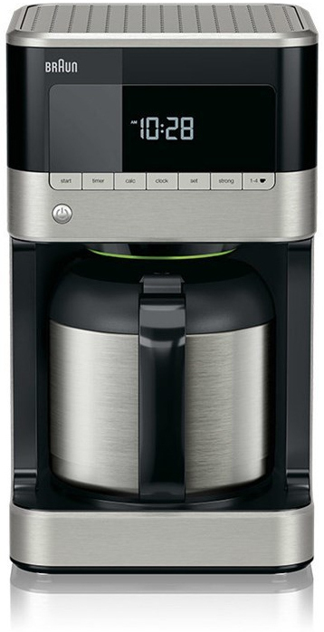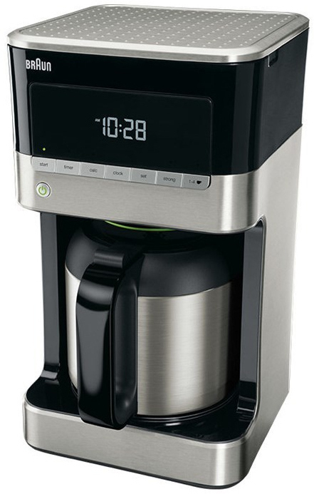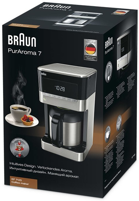 Braun KF 7125. Tipo de producto: Cafetera de filtro, Capacidad de reservorio de agua: 1,25 L, Café tipo de entrada: De café molido, Depósito para café preparado: Termos, Capacidad en tazas: 10 tazas. Tipo de visualizador: LCD. Potencia: 1000 W. Color del producto: Negro, Acero inoxidable