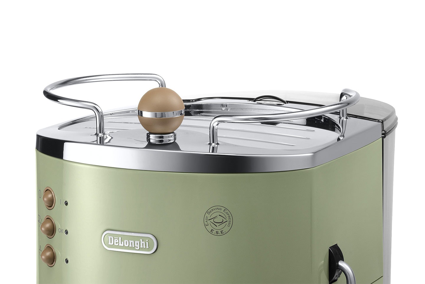 DeLonghi Icona Vintage. Diseño: Independiente, Tipo de producto: Máquina espresso, Máquina de café: Totalmente automática, Capacidad de reservorio de agua: 1,4 L, Café tipo de entrada: Dosis de café, De café molido, Capacidad en tazas: 2 tazas. Potencia: 1100 W. Color del producto: Verde
