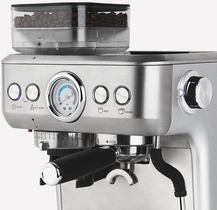 H.Koenig EXPRO980. Tipo de producto: Máquina espresso, Capacidad de reservorio de agua: 2,7 L, Café tipo de entrada: Granos de café, Depósito para café preparado: Taza, Capacidad en tazas: 2 tazas, Molinillo integrado. Tipo de visualizador: Analógica. Potencia: 1620 W. Color del producto: Acero inoxidable