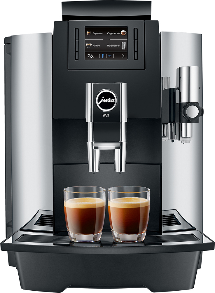 JURA WE8. Tipo de producto: Máquina espresso, Máquina de café: Totalmente automática, Capacidad de reservorio de agua: 3 L, Café tipo de entrada: Granos de café, Depósito para café preparado: Taza, Capacidad en tazas: 25 tazas, Número de surtidores: 2, Molinillo integrado. Potencia: 1450 W. Color del producto: Negro, Cromo
