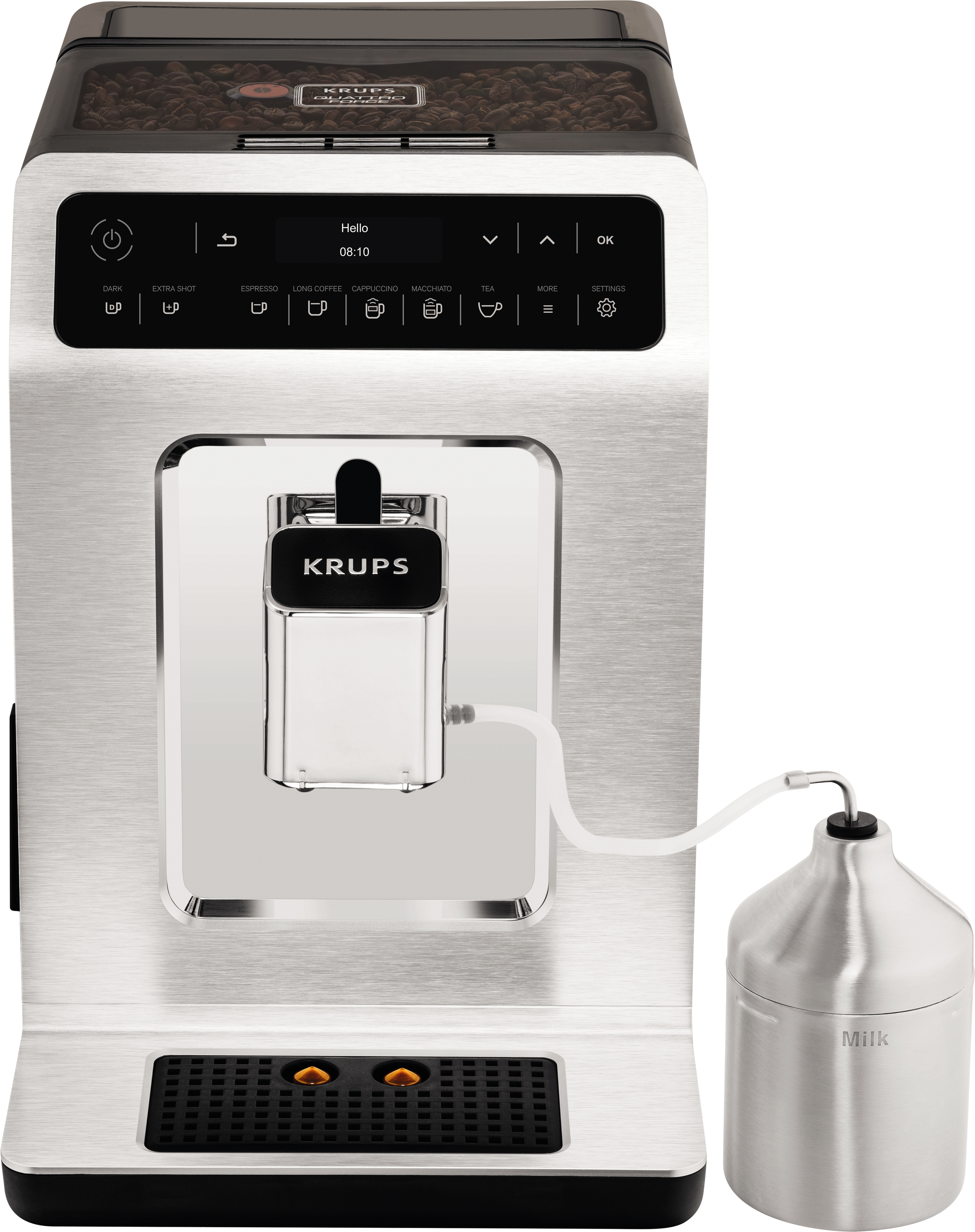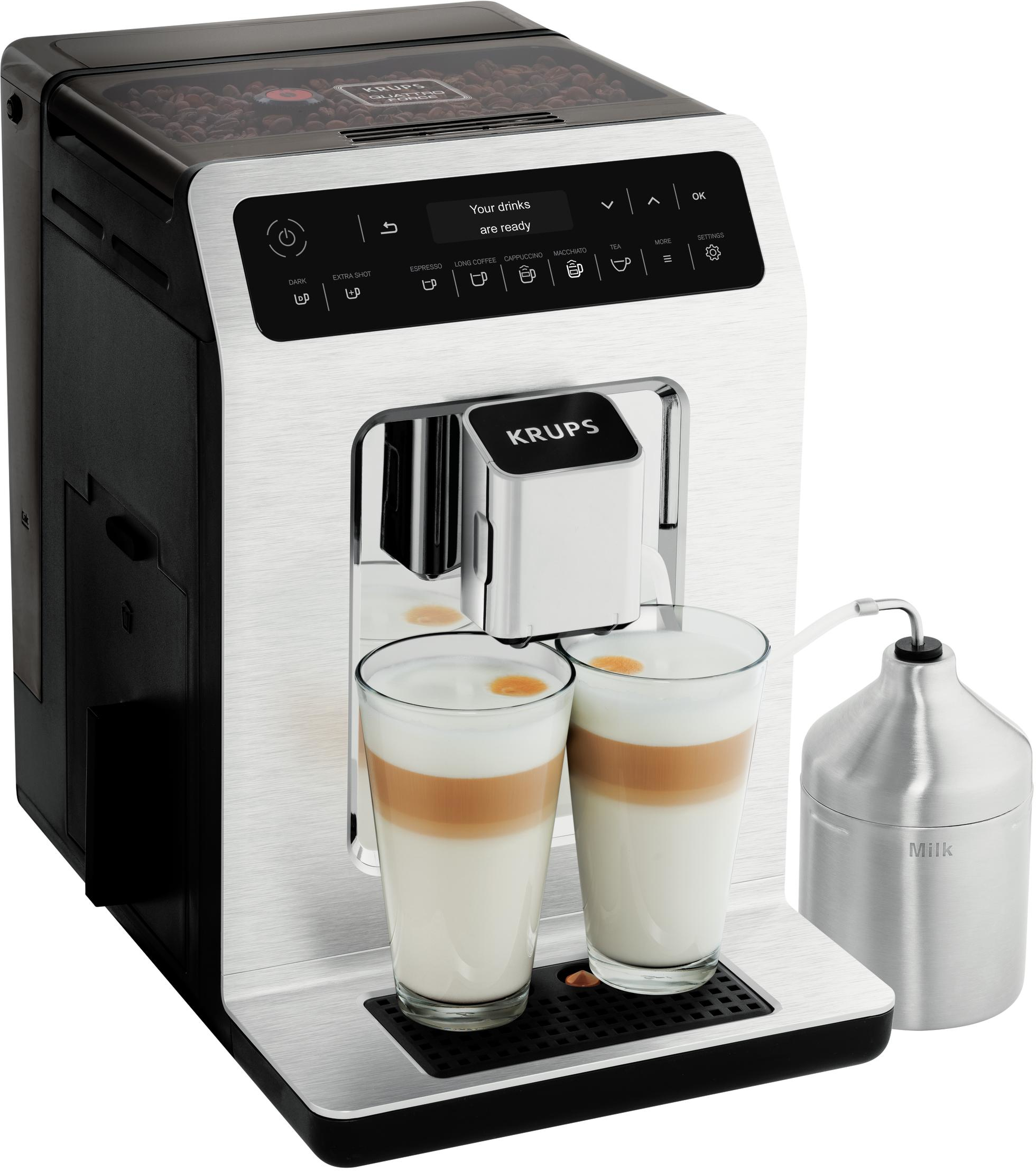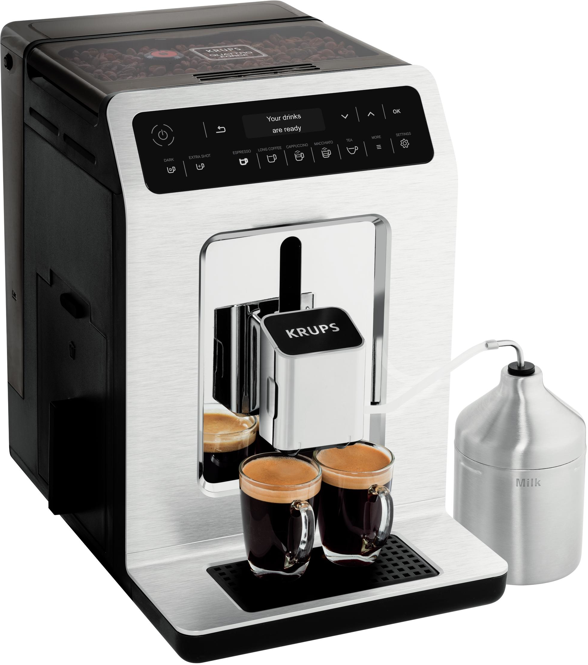 Krups Evidence EA891D. Tipo de producto: Máquina espresso, Máquina de café: Totalmente automática, Capacidad de reservorio de agua: 2,3 L, Café tipo de entrada: Granos de café, Capacidad en tazas: 2 tazas, Molinillo integrado. Tipo de visualizador: LED. Potencia: 1450 W. Color del producto: Cromo, Metálico