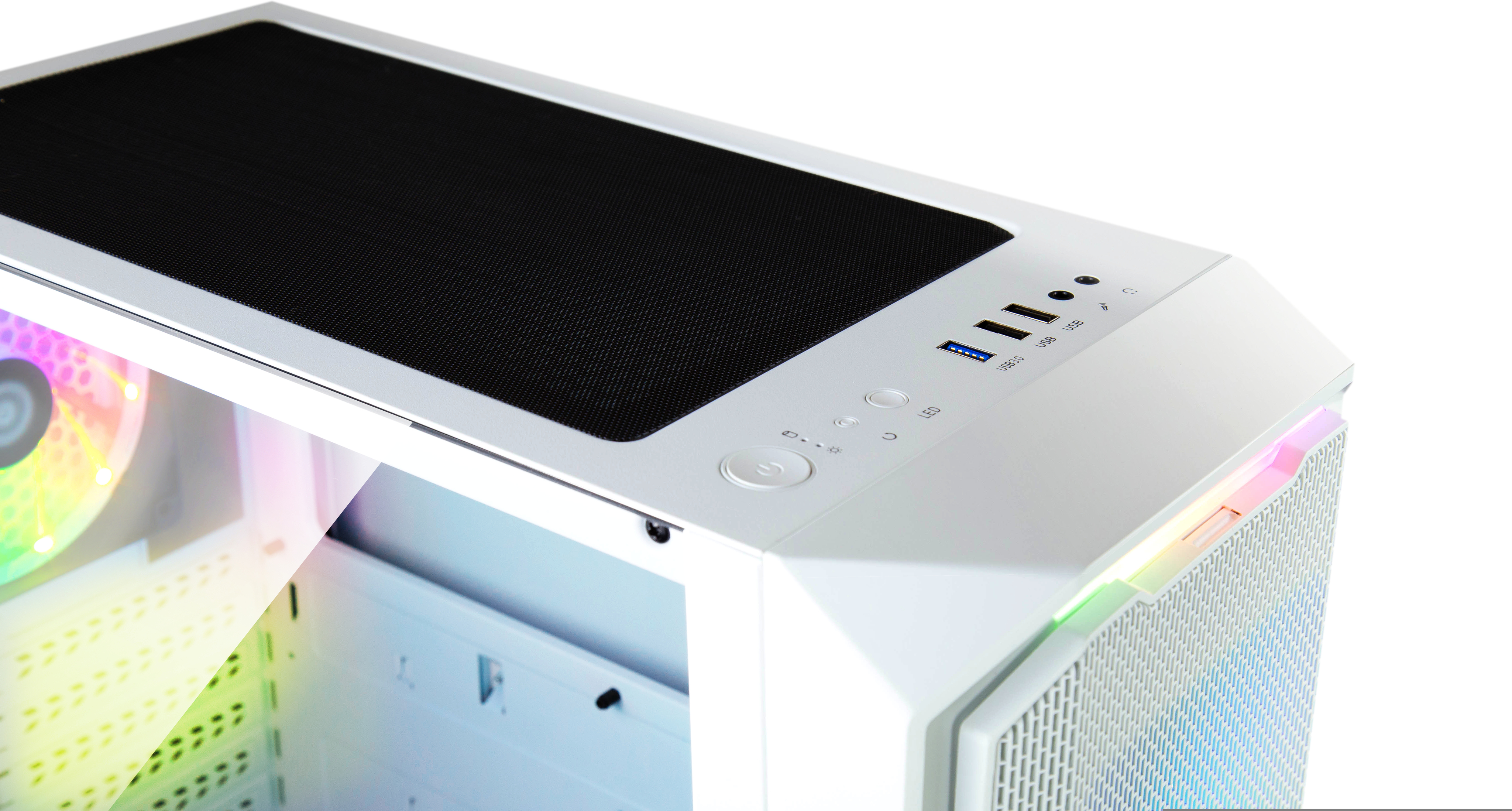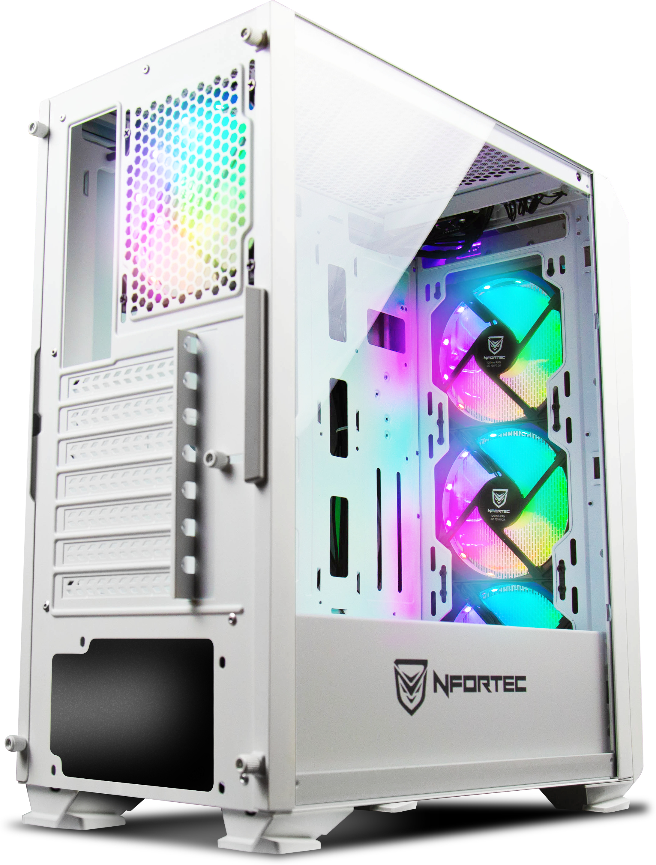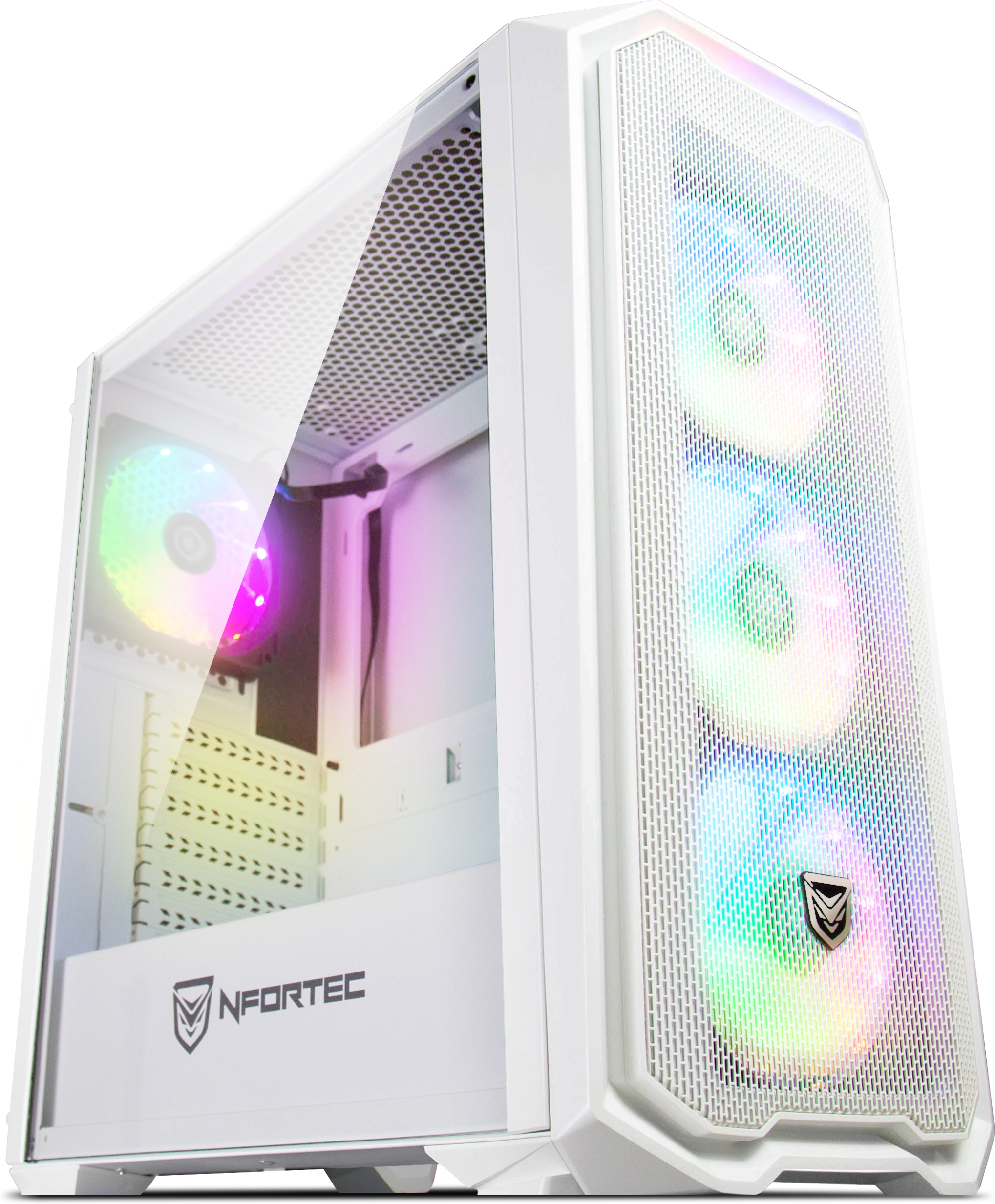 Refrigeración a ritmo de ARGB\n\nNuestra nueva torre Nfortec Krater cuenta con cuatro ventiladores ARGB, ubicados, tres en el frontal y el último en la parte trasera. Esta composición, junto a la tira LED que encontramos en la parte superior del frontal nos permiten crear efectos realmente espectaculares gracias a sus 20 modos distintos de iluminación seleccionables a través del mando a distancia que incluye. Siguiendo nuestra línea, Krater, es compatible con las últimas tecnologías RGB de las placas base de GIGABYTE, Asus y MSI.\n\nVentilación fuera de serie\n\nGracias a sus cuatro potentes ventiladores de 120mm y su panel frontal mallado, Nfortec Krater te proporcionará unos niveles óptimos de temperatura con los que podrás sacar el máximo rendimiento a tus componentes. Además, su carenado inferior full cover aísla completamente el calor que expulsa la fuente de alimentación evitando así una mayor transferencia del calor.\n\nFlujo de aire\n\nLos tres ventiladores frontales de Nfortec Krater impulsan un gran caudal de aire frío hacia su interior manteniendo a raya las altas temperaturas que alcanzan los equipos y potenciando su funcionalidad. Contando también, al otro lado, con nuestro ventilador trasero que irá expulsando todo el aire caliente que genera nuestra torre gaming.\n\nPerfecto para cualquier configuración\n\nNfortec Krater presenta un chasis fabricado en acero que te proporcionará la seguridad que buscas para tus componentes. Su estructura la hace compatible con placas base ATX, M-ATX, ITX y E-ATX permitiendo múltiples combinaciones para tus composiciones. Además, gracias a sus filtros antipolvo superiores e inferiores magnetizados conseguirás un mantenimiento de la caja mucho más cómodo.\n\nAmplias posibilidades\n\nGracias a su diseño, podremos disfrutar de una gran cantidad de opciones de montaje en Nfortec Krater. En su interior podremos colocar tarjetas gráficas de hasta 320mm o Cooler con altura máxima de 160mm. Su carenado inferior tiene capacidad para fuentes de alimentación con 205mm y su frontal está preparado para soportar radiadores de hasta 360mm. Todo esto en una torre con unas dimensiones de 400x208x458mm.\n\nUn frontal a la altura\n\nDesde su zona superior podrás controlar todos los aspectos de Krater. A parte de los dos jacks HD de 3.5mm para audio y micro encontraremos también el botón de Power más el de Reset que irán acompañados del botón LED para controlar todos los efectos ARGB que podrás disfrutar. Gracias a sus puertos USB, dos 2.0 y otro extra 3.0 tendrás todas las comodidades para tus periféricos.