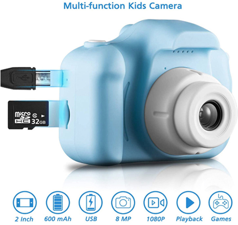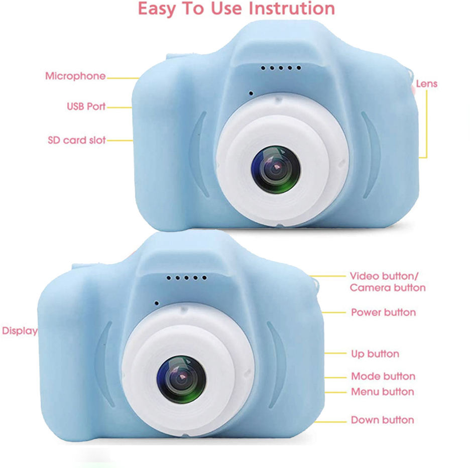 Mini cámara para niños equipada con una pantalla de alta definición de 2.0 pulgadas, lente de 13 megapíxeles, resolución de vídeo: 1920 * 1080; resolución de la cámara :4000 * 3000. Batería incorporada con capacidad de 400mA y voltaje de carga de 5v para USB de carga rápida.