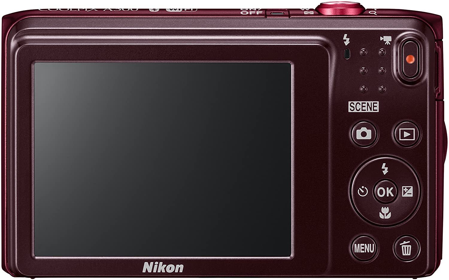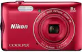 Nikon COOLPIX A300. Tipo de cámara: Cámara compacta, Megapixeles: 20,1 MP, Tamaño del sensor de imagen: 1/2.3"", Tipo de sensor: CCD, Máxima resolución de imagen: 5152 x 3864 Pixeles. Sensibilidad ISO (max): 3200. Zoom óptico: 8x, Zoom digital: 4x, Intervalo de longitud focal: 4,5 - 36 mm. Wifi. Máxima resolución de video: 1280 x 720 Pixeles. Diagonal de la pantalla: 6,86 cm (2.7""). PictBridge. Peso: 119 g. Color del producto: Rojo