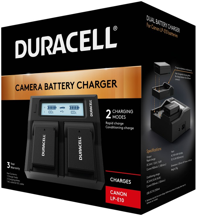 Duracell DRC6105. Productos compatibles: Canon LP-E10. La tensión de carga: 8.4 V. Ancho: 111 mm, Profundidad: 125 mm, Altura: 40 mm. Ancho del paquete: 150 mm, Profundidad del paquete: 150 mm, Altura del paquete: 100 mm