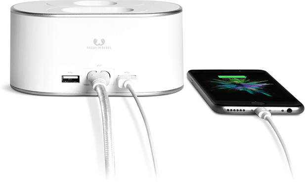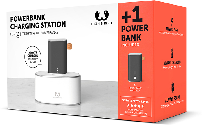 Siempre cargados y listos para su uso.\n¿Te encantan los Powerbanks Fresh ‘n Rebel pero sueles olvidarte de cargarlos antes de salir de casa? Gracias a la Powerbank Charging Station mantendrás tus Powerbanks cargados y listos para su uso en todo momento. Puede cargar dos a la vez y sirve para cualquier Powerbank de Fresh ‘n Rebel gracias a los adaptadores de Powerbank incluidos. Con 2 A, las dos ranuras de carga cargan tus Powerbanks el doble de rápido que un cargador normal. Los dos puertos USB extra de la parte trasera de la estación de carga son ideales para cargar otros dispositivos. El puerto de 1 A carga tu teléfono y otros dispositivos a velocidad normal, mientras que el puerto de 2,4 A los carga el doble de rápido y es también ideal para tabletas.\n\nSiempre cargados, siempre listos\nColoca la Powerbank Charging Station en un punto central de tu casa y carga todos tus dispositivos desde un único punto práctico. Deja de buscar tus Powerbanks o dispositivos móviles. La Powerbank Charging Station presenta un diseño neutro y compacto, con un toque moderno y combina a la perfección con cualquier estilo de decoración. Tus Powerbanks pueden permanecer enchufados en todo momento y siempre estarán cargados cuando los necesites.