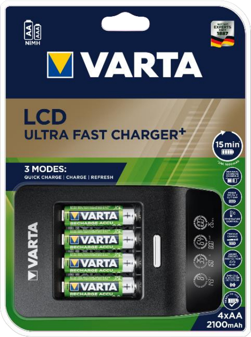 Varta 57685 101 441. Alimentación: Corriente alterna, Tamaño de baterías compatibles: AA, AAA. Color del producto: Negro, Tecnología de visualización: LCD. Voltaje de entrada: 100-240 V. Tamaño de la pila: AA, Capacidad de batería: 2100 mAh, Voltaje de la pila: 12 V. Ancho del paquete: 180 mm, Profundidad del paquete: 80 mm, Altura del paquete: 240 mm