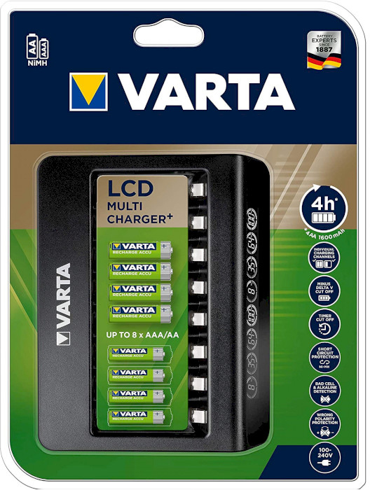 Varta LCD Multi Charger+. Adecuado para: Pilas de uso doméstico, Alimentación: Corriente alterna, Tecnología de baterías compatibles: Níquel-metal hidruro (NiMH). Color del producto: Negro, Tecnología de visualización: LCD. Voltaje de entrada: 100 - 240 V, Tiempo de recarga de la batería: 4 h, Corriente de carga: AAA - 200mA, AA - 450mA. Cantidad por paquete: 1 pieza(s)