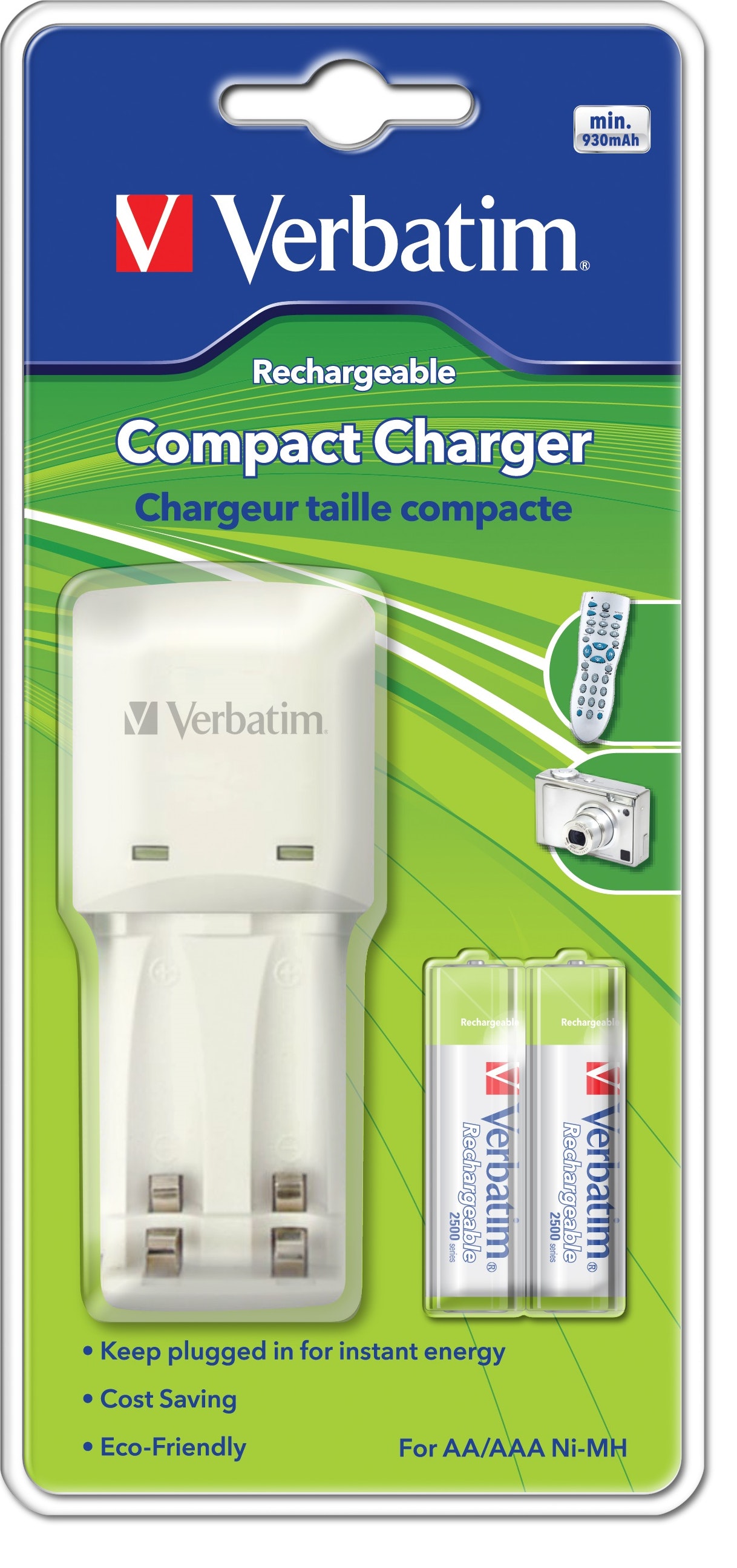 El nuevo cargador compacto de Verbatim está diseñado para cargar baterías NiMH, tanto de de tamaño AA como AAA. Este cargador es respetuoso con el medioambiente y ayuda a reducir gastos gracias a que cada batería recargable equivale a 500-1000 pilas alcalinas. \n\nPara obtener un rendimiento óptimo, mantenga el cargador enchufado para obtener energía al instante. Los indicadores LED verdes permanecerán encendidos durante la carga y se apagarán solo si el cargador se desenchufa o si se retiran las baterías. \n\nSimplemente enchúfelo directamente a la alimentación e inserte sus baterías. Puede recargar las baterías completamente en tan solo 7 horas. En baterías nuevas, se requieren 2 o 3 cargas y ciclos de uso, para optimizar el rendimiento de las baterías.