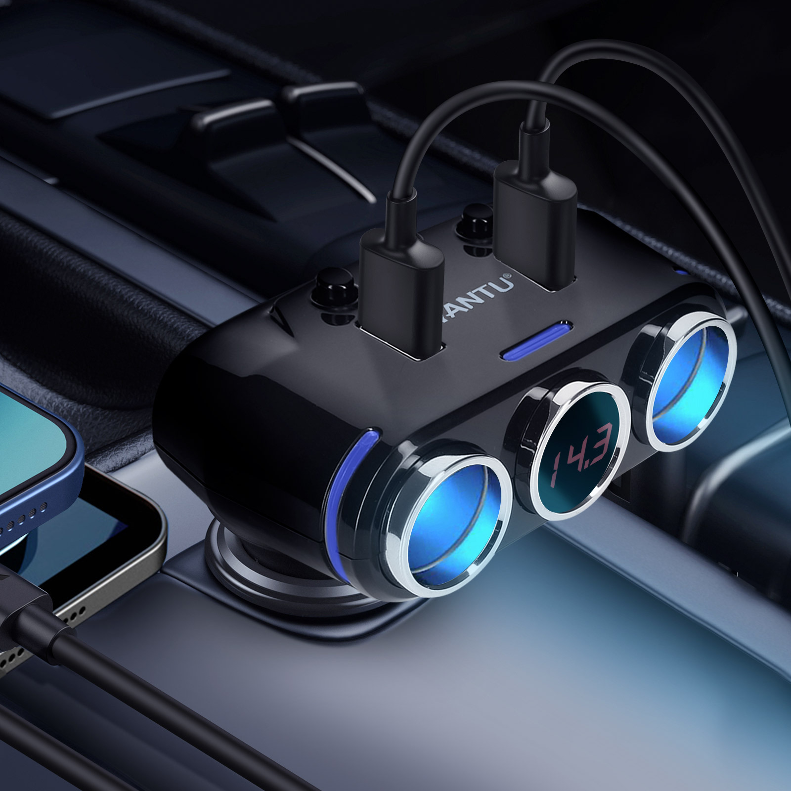 Cargador de coche plegable a 90°. Potencia total de 100 W con 2 puertos para encendedor y 2 puertos USB para carga simultánea. Pantalla LED que muestra el voltaje de la batería. Carga de seguridad antisobrecalentamiento. Dimensiones 91x50x32mm.Características y Puntos fuertes: Cargador de coche negro con un diseño plegable a 90° y sin cables voluminosos para facilitar su uso2 puertos de mechero para conectar hasta 2 cargadores de cocheCada puerto del encendedor tiene su propio botón de encendido y apagado.Pantalla LED para controlar el voltaje de la batería para un uso seguro