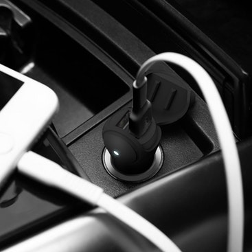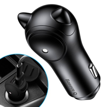 Cargador para coche con forma de gato marca Baseus para cargar tus dispositivos mientras vas en el coche. Con dos puertos USB y tecnología de carga rápida. Con capuchón protector y LED (ON/OFF).