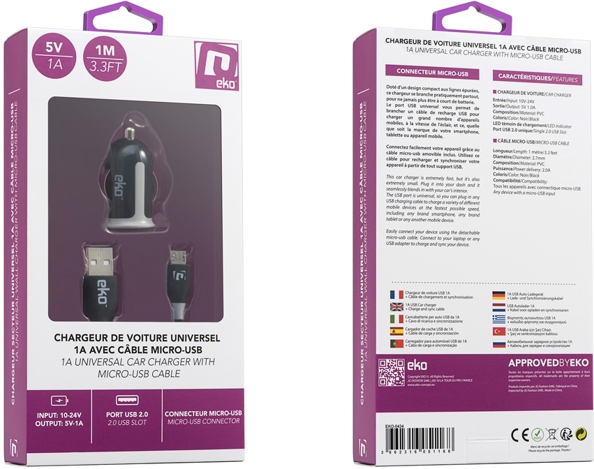Eko Pack cargador de mechero 1A con cable micro USB de 1 m Negro
