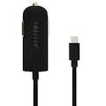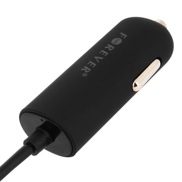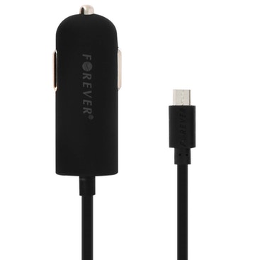 Cargador para coche 2.1A con conector Micro-USB marca Forever. Para carga el móvil mientras vas en el coche. El cable mide 1,5 metros y viene integrado en el cargador.