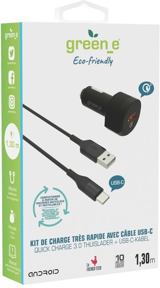 green_e Greene Cargador de coche QC 3 USB 3A con cable USB-A a USB-C de 1,3M Negro
