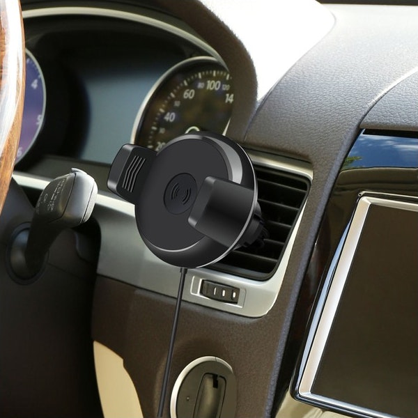 En el coche conviene no tener mas cables que los imprescindibles. Si empiezas a conectar todos tus dispositivos portatiles mediante cables puedes acabar convirtiendo el salpicadero en una mara?a de distracciones para la conduccion. Los sistemas de carga inalambricos con estandar Qi han simplificado mucho el panorama. Entre otras cosas porque ya no vas a depender de un cable para revivir la bateria de tu Iphone6/6s mientras vas conduciendo, y asi podras prestar mas atencion a la carretera, que es lo verdaderamente importante cuando vas al volante. Este modelo de Iphone no esta preparado para la carga por induccion es por ello que incluimos un modulo receptor. Es decir, unicamente tienes que conectar el modulo a tu telefono y establecer contacto entre tu movil y esta base y tu bateria empezara a cargarse de manera automatica. El cargador Qi inalambrico esta provisto de una pinza trasera que se ajusta a la salida del aire acondicionado y una pegatina circular que se coloca en la parte trasera de tu movil y que te servira para colocar el terminal sobre la base de carga cuando vayas conduciendo. El cabezal del cargador es giratorio en un angulo de 360? de tal modo que podras consultar tu movil mientras lo cargas, por ejemplo si vas utilizando el GPS. Y como es la base la que va conectada a la corriente (el encendedor del vehiculo) mediante un cable USB, no tendras que estar manipulando ningun otro accesorio mientras conduces: unicamente colocas tu Iphone 6/6s en la posicion correcta y comienza la carga.- Material: ABS, PC y metal - Color: Negro - Entrada: DC 5V/2000 ma - Frecuencia: 100 200 KHz - Distancia de carga: 4 10 mm - Eficiencia de conversion de carga: hasta 73% - Cabezal giratorio 350? - Compatible con los dispositivos que utilizan el estandar Qi