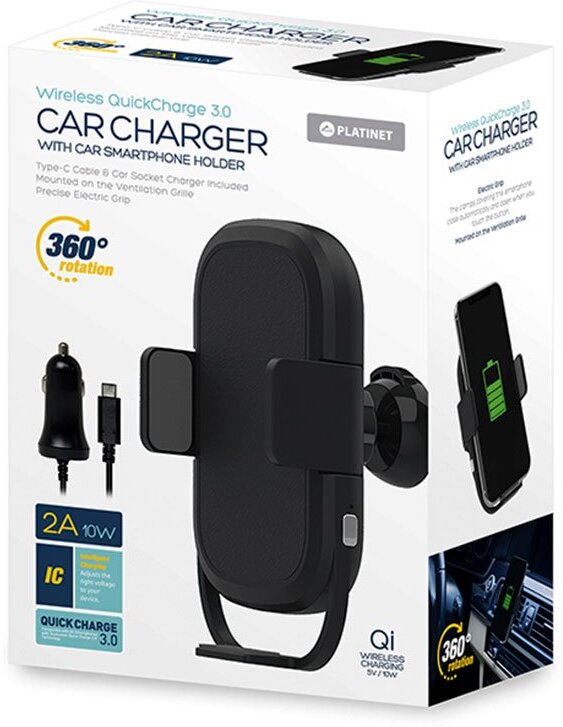 Soporte de Rejilla Con Carga Inalámbrica.El soporte para automóvil PUCHWI también es un cargador inalámbrico que funciona en el estándar Qi.La superficie de carga llena toda la base del soporte, así que simplemente inserte el teléfono inteligente en el soporte para comenzar a cargar automáticamente.El producto no tiene su propia fuente de alimentación, por lo tanto, para su funcionamiento (apertura y cierre del mecanismo y carga inalámbrica) se requiere una conexión permanente con una fuente de alimentación.El conjunto incluye un cable USB y un cargador para automóvil con soporte para la tecnología de carga rápida Quick Charge 3.El soporte tiene un conector USB tipo C, por lo que se puede conectar a la fuente de alimentación con cualquier otro cable.CARACTERÍSTICAS TÉCNICAS:Modelo: PUCHWIMarca: PlatinetColor: NegroEntrada: 5V / 2A 9V / 1.67ASalida: 10 W (MAX)Eficiencia de carga: 73%Distancia de transmisión: 8 mmFrecuencia de trabajo: 110-205 KHzDimensiones: 126 x 70.5 x 41 mm.Funciona con todos los dispositivos que admiten la función carga rápida (Qi)Cargador inalambrico QIAgarre precisoRotación de 360 gradoTipo de Conexión: Qi