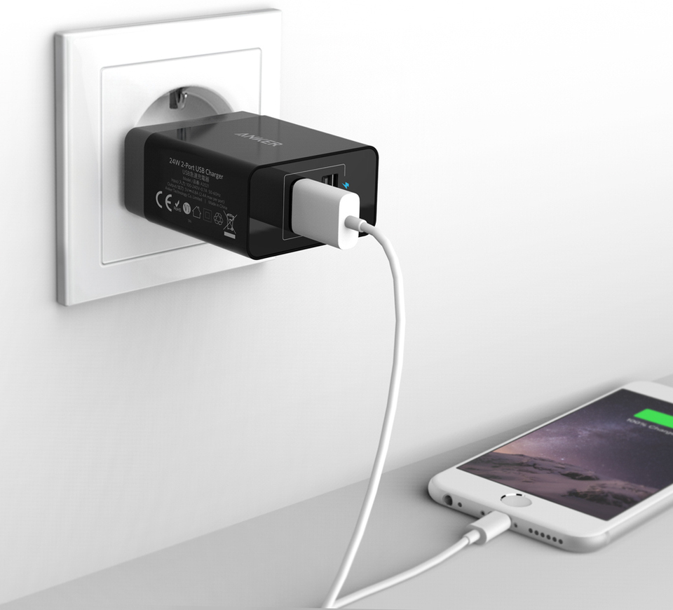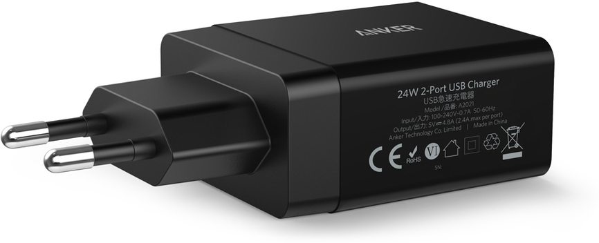 Anker A2021313. Tipo de cargador: Interior, Exterior, Alimentación: Corriente alterna, Compatibilidad del cargador: Smartphone, Tableta. Voltaje de entrada: 100 - 240 V, Voltaje de salida máximo: 5 V. Cantidad de puertos USB 2.0: 2. Color del producto: Negro