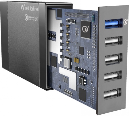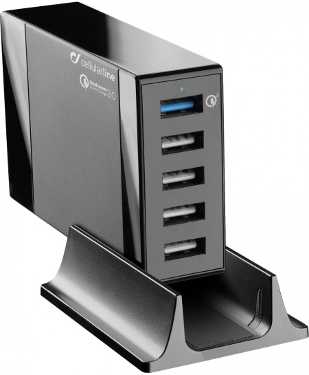 USB Energy Station QC es un cargador de baterías de red dotado de 5 puertos USB que, gracias a la tecnología Qualcomm Quick Charger 3.0 y a la tecnología Smartphone Detect, es capaz de cargar de forma rápida y segura smartphone y tablet incluso simultáneamente, incluidos los de tecnología 1A, 2A, 5W, 10W y Quick Charge, además de los smartphone Samsung con carga adaptativa. Además, el práctico soporte permite mantener USB Energy Station QC en posición vertical de forma estable y fija durante su uso.