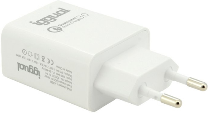 Carga todos tus dispositivos móviles con el cargador rápido de pared USB QC3.0 de 18W de iggual. Es un cargador compacto y muy versátil que ofrece una energía de hasta 9V y 2A.\n\nMaximiza la carga sin comprometer la eficiencia ni la vida útil de la batería gracias al algoritmo que ofrece la tecnología Quick Charge 3.0 de Qualcomm, el cual permite al dispositivo móvil determinar qué potencia requerir del cargador en cada momento.\n\n100% compatible con cualquier carga a través de USB y con infinidad de dispositivos portátiles: teléfonos móviles, tablets, reproductores multimedia, cámaras, vaporizadores, PowerBanks o cualquier otro dispositivo que requiera de una alimentación por toma USB-A, micro o tipo C.\n\nGracias a su reducido tamaño y a su bajo peso, podrás llevártelo contigo a todas partes de la manera más cómoda.