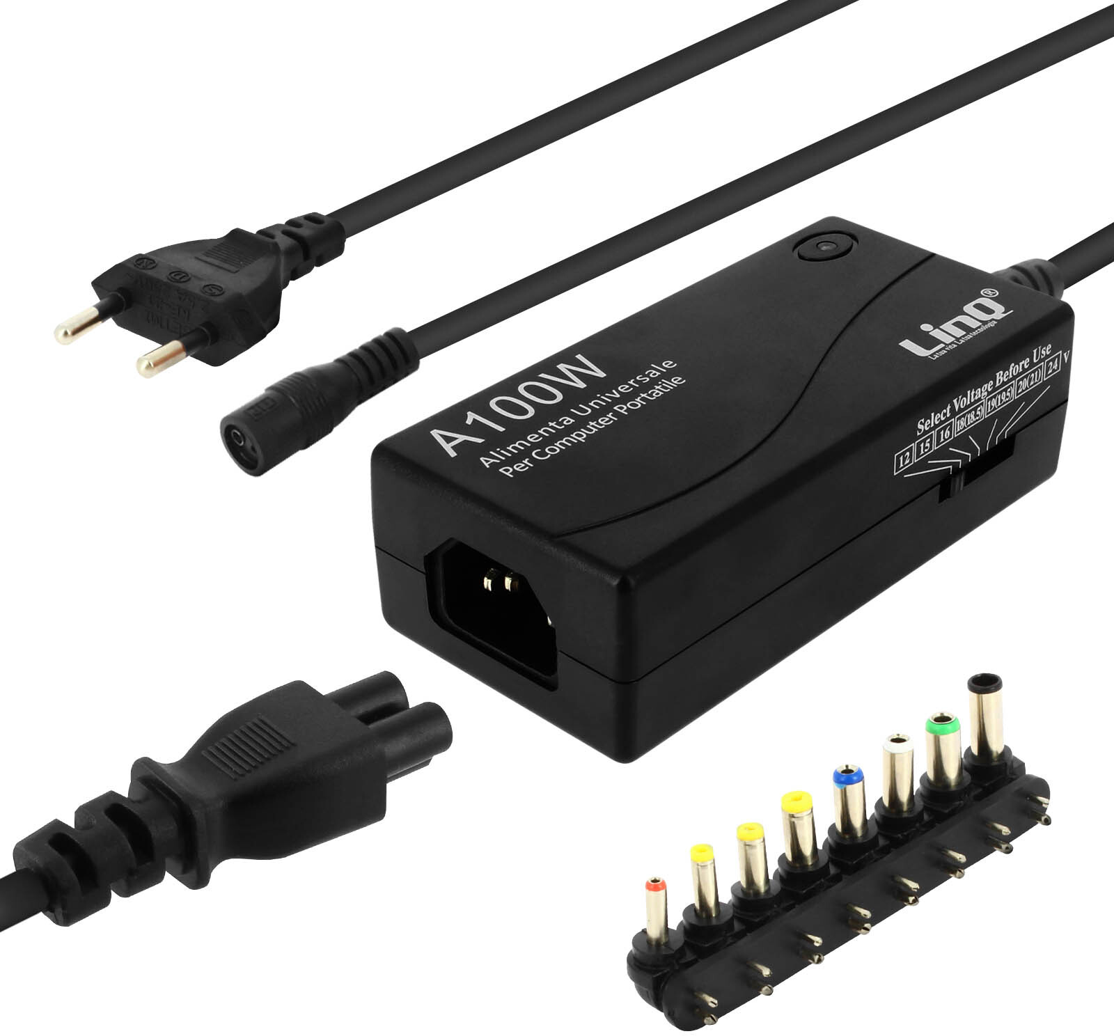 Cargador universal de LinQ para portátil. Potencia de salida de 100W para una carga rápida. Se entrega con 8 conectores diferentes (3 a 12V) para una amplia compatibilidad. Puerto USB 2.1A incorporado. Clave de cambio de tensión incluida.