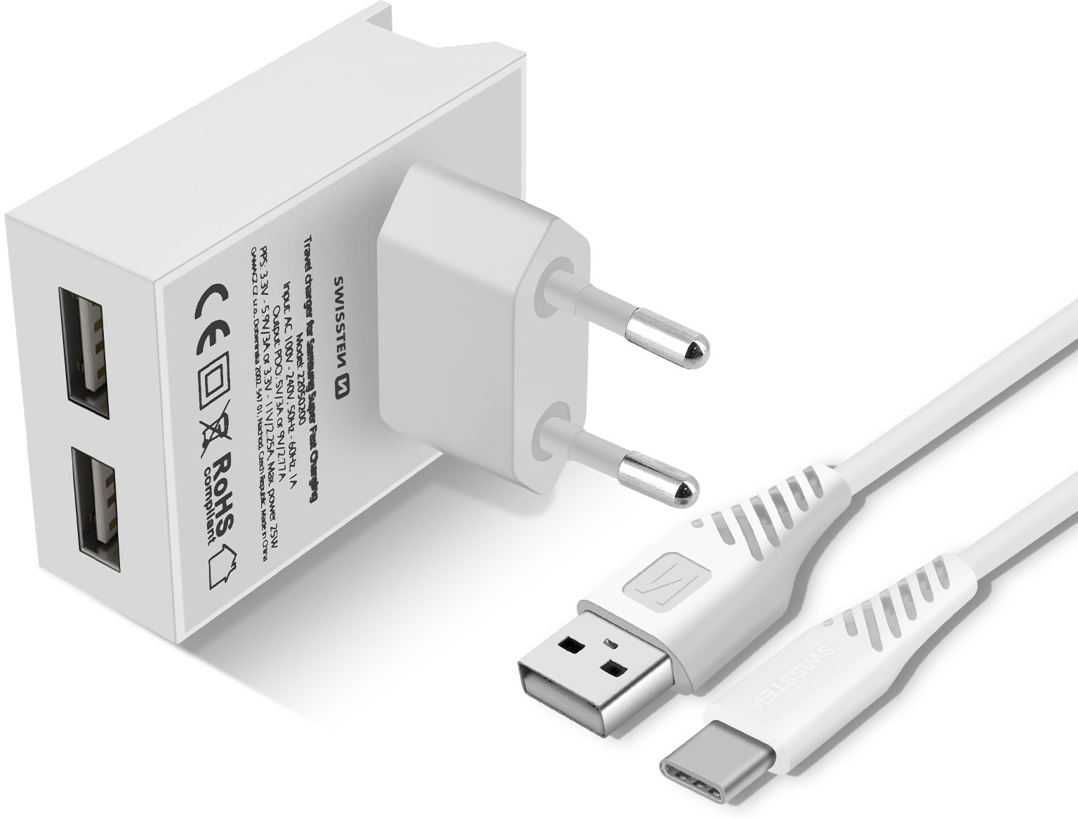 Swissten Cargador Doble USB 3A Smart IC + Cable USB-C Slim - Blanco