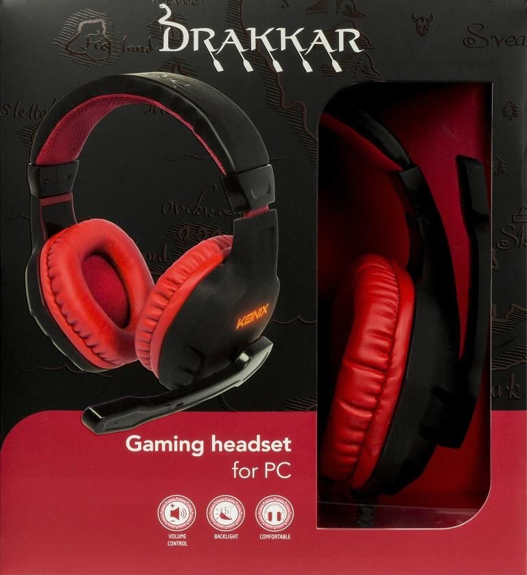Konix Drakkar. Utilizar con: PC/Juegos. Tipo de auricular: Binaural, Estilo de uso: Diadema, Color del producto: Negro, Rojo. Tecnología de conectividad: Alámbrico, Longitud de cable: 1,8 m. Audifonos: Circumaural, Frecuencia de auricular: 20 - 20000 Hz, Sistema acústico: Cerrado. Adaptadores de audio incluidos: 3,5 mm