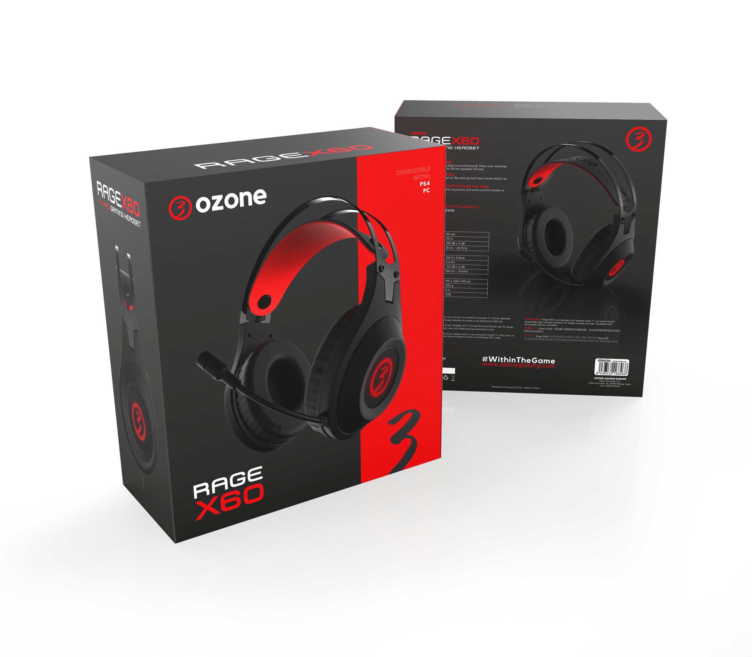 Ozone OZRAGEX60. Utilizar con: Consola de videojuegos + PC/Videojuegos, Canales de salida de audio: 7.1 canales. Tipo de auricular: Binaural, Estilo de uso: Diadema, Color del producto: Negro, Rojo. Tecnología de conectividad: Alámbrico, Longitud de cable: 2 m. Audifonos: Circumaural, Frecuencia de auricular: 18 - 20000 Hz, Obstrucción: 32 O. Frecuencia de micrófono: 100 - 10000 Hz, Sensibilidad de micrófono: -54 dB, Micrófono, impedancia de salida: 2200 O