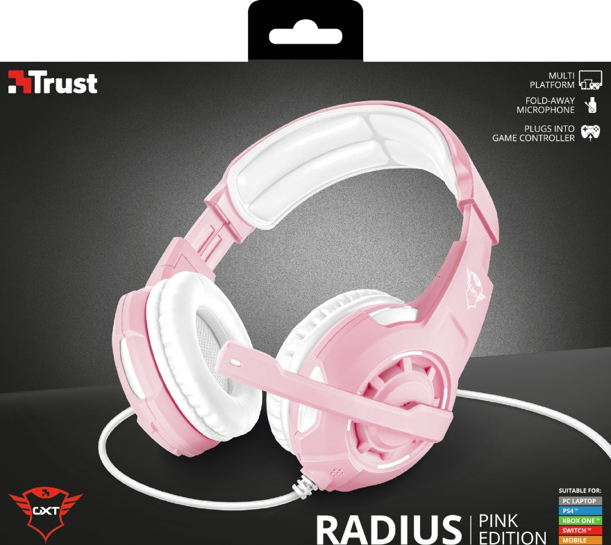 Trust GXT 310P Radius. Utilizar con: PC/Juegos, Canales de salida de audio: 2.0 canales. Tipo de auricular: Binaural, Estilo de uso: Diadema, Color del producto: Rosa, Blanco. Tecnología de conectividad: Alámbrico, Longitud de cable: 1 m. Audifonos: Supraaural, Frecuencia de auricular: 20 - 20000 Hz, Obstrucción: 36 O. Tipo de dirección de micrófono: Omnidireccional