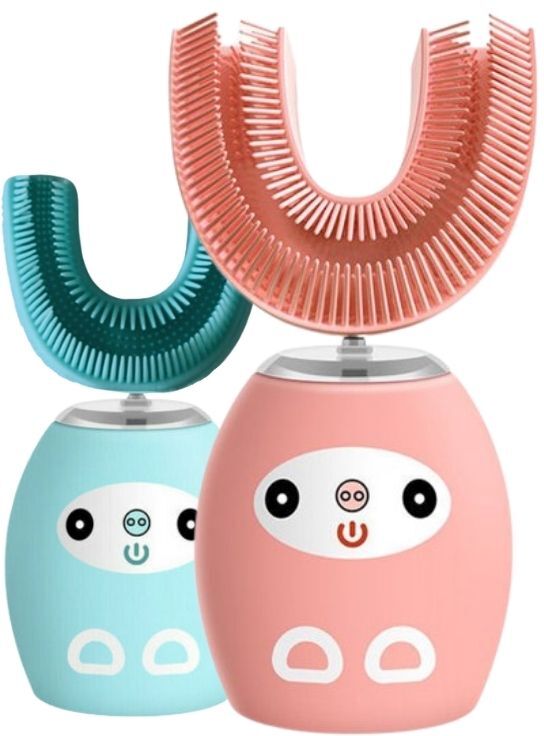 ¡Lavarse los dientes nunca ha sido tan divertido!.Este cepillo ayuda a los niños a lavar sus dientes ampliamente y mantener una buena higiene bucal..Con su diseño innovador y en forma de U, el cepillo puede facilitar el trabajo diario y al mismo tiempo desarrollar un hábito de buena higiene bucal..La cabeza en forma de U con cerdas de 45º y 90º se adapta perfectamente a los dientes de los niños. La limpieza se realiza con pequeñas vibraciones,.sin dañar las encías y es bastante rápido. Las cerdas de silicona suaves son lo suficientemente suaves como para usar en los dientes sensibles de.niños..Su caja puede servir como vidrio para el agua y proteger simultáneamente el cepillo de todas las bacterias..Características.Material: Calidad de alimentos Silicona + ABS.Poder: 3.7V.Tiempo de carga: 120 min..Impermeable: IPX7.Edad recomendada: 3-12 años.El paquete incluye.1x cepillo.1x cabezal de cepillo de silicona.1x cable de carga USB.1x instrucciones