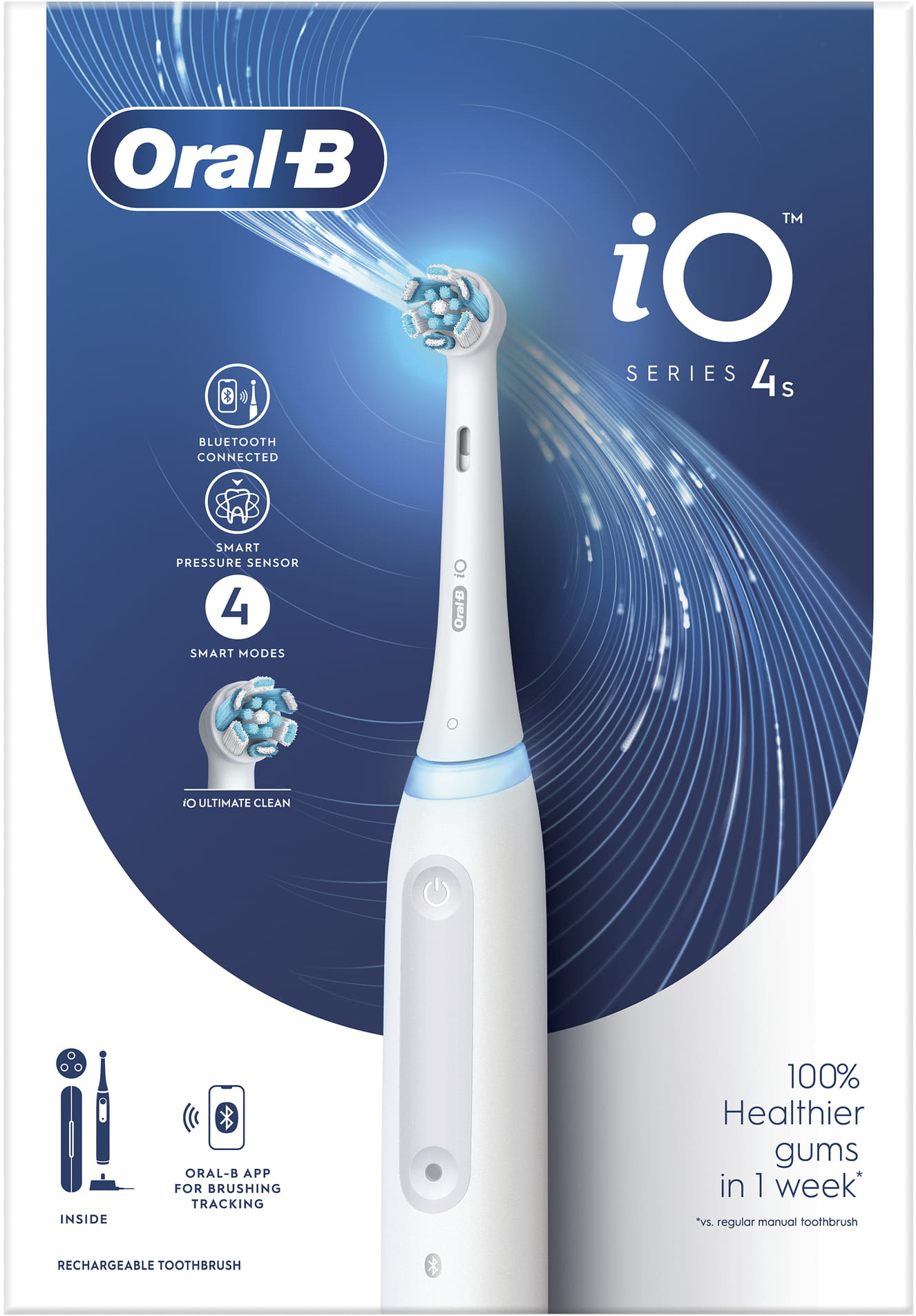 Oral-B iO 4S. Utilizar con: Adulto, Tipo de cepillo de dientes: Cepillo dental vibratorio, Modos del cepillo de dientes: Cuidados diarios, Sensible, Super sensitive, Blanqueador. Fuente de energía: Batería, Tipo de batería: Batería integrada. Tipo de embalaje: Caja. Número de empuñaduras incluidas: 1 pieza(s), Número de cabezales incluido: 1 pieza(s)
