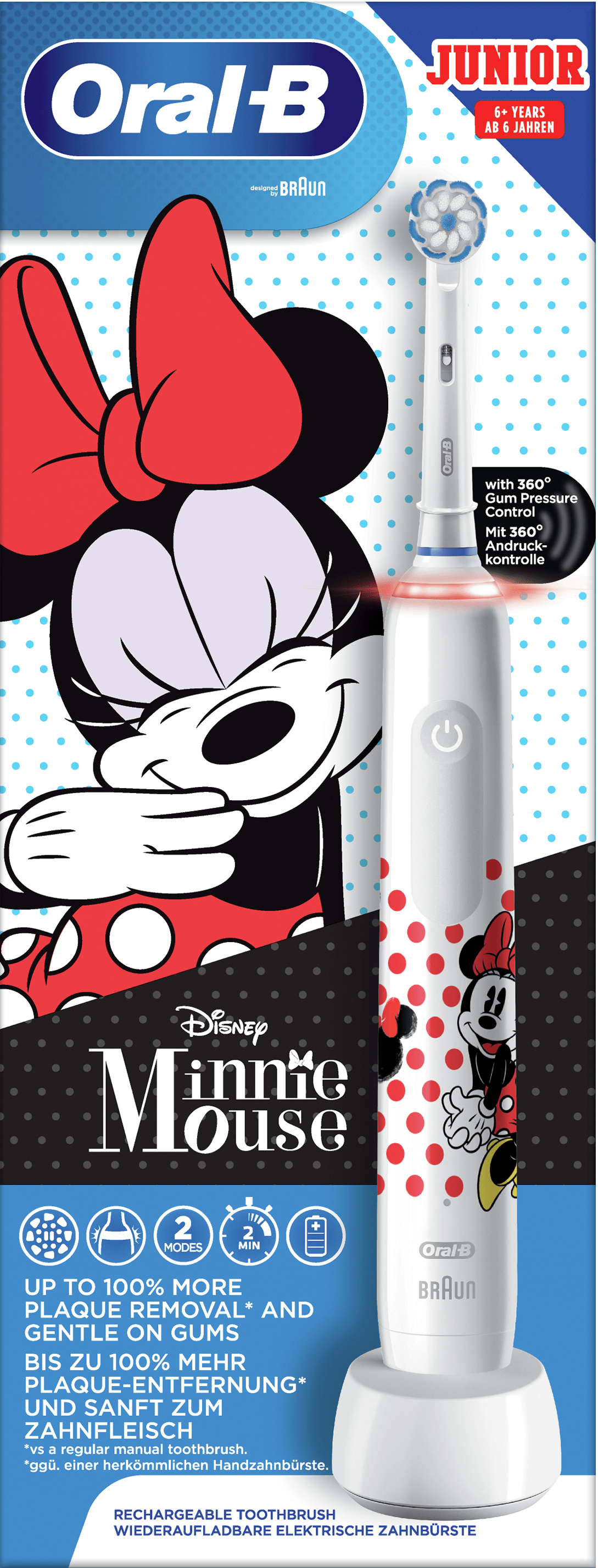 Oral-B Junior 80353791. Utilizar con: Niño, Tipo de cepillo de dientes: Cepillo dental giratorio, Modos del cepillo de dientes: Cuidados diarios, Sensible. Fuente de energía: Batería, Tipo de batería: Batería integrada, Autonomía: 336 h. Peso: 267,65 g, Ancho del paquete: 65 mm, Profundidad del paquete: 98 mm. Número de empuñaduras incluidas: 1 pieza(s), Número de cabezales incluido: 1 pieza(s). Cantidad por paquete: 1 pieza(s), Ancho de la caja principal: 19,7 cm, Longitud de la caja: 20,5 cm
