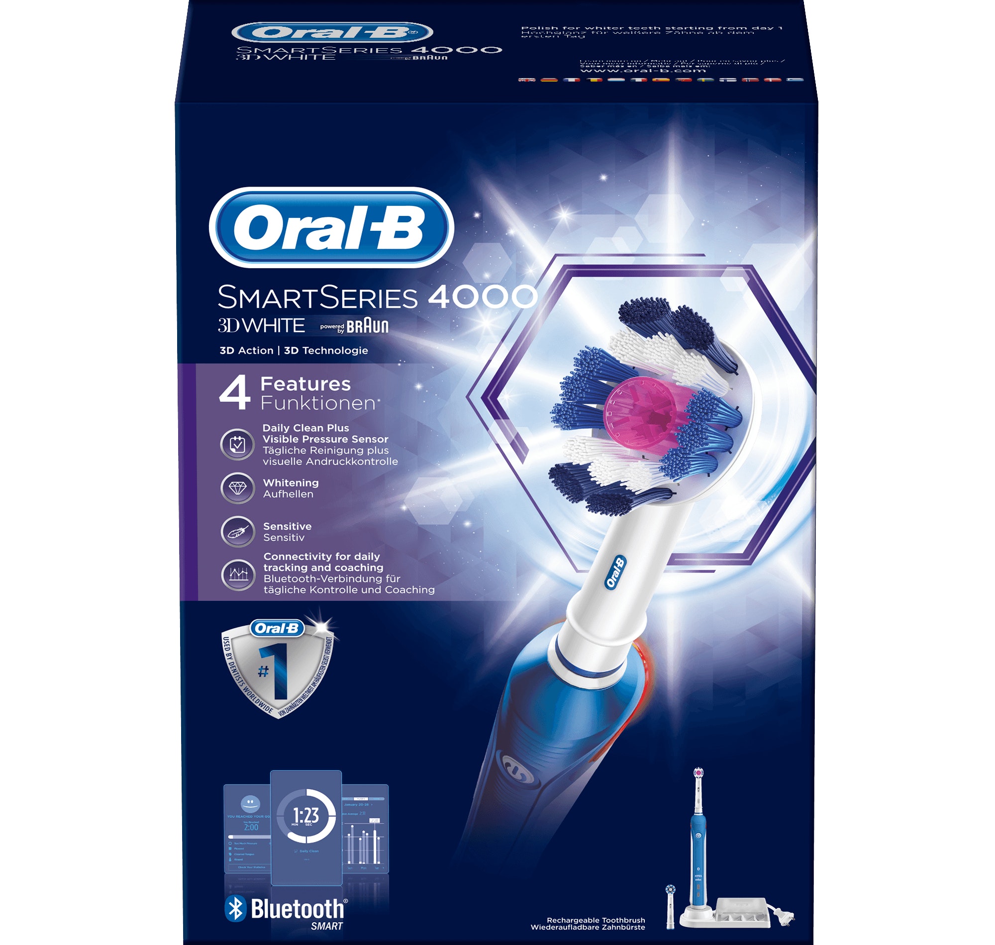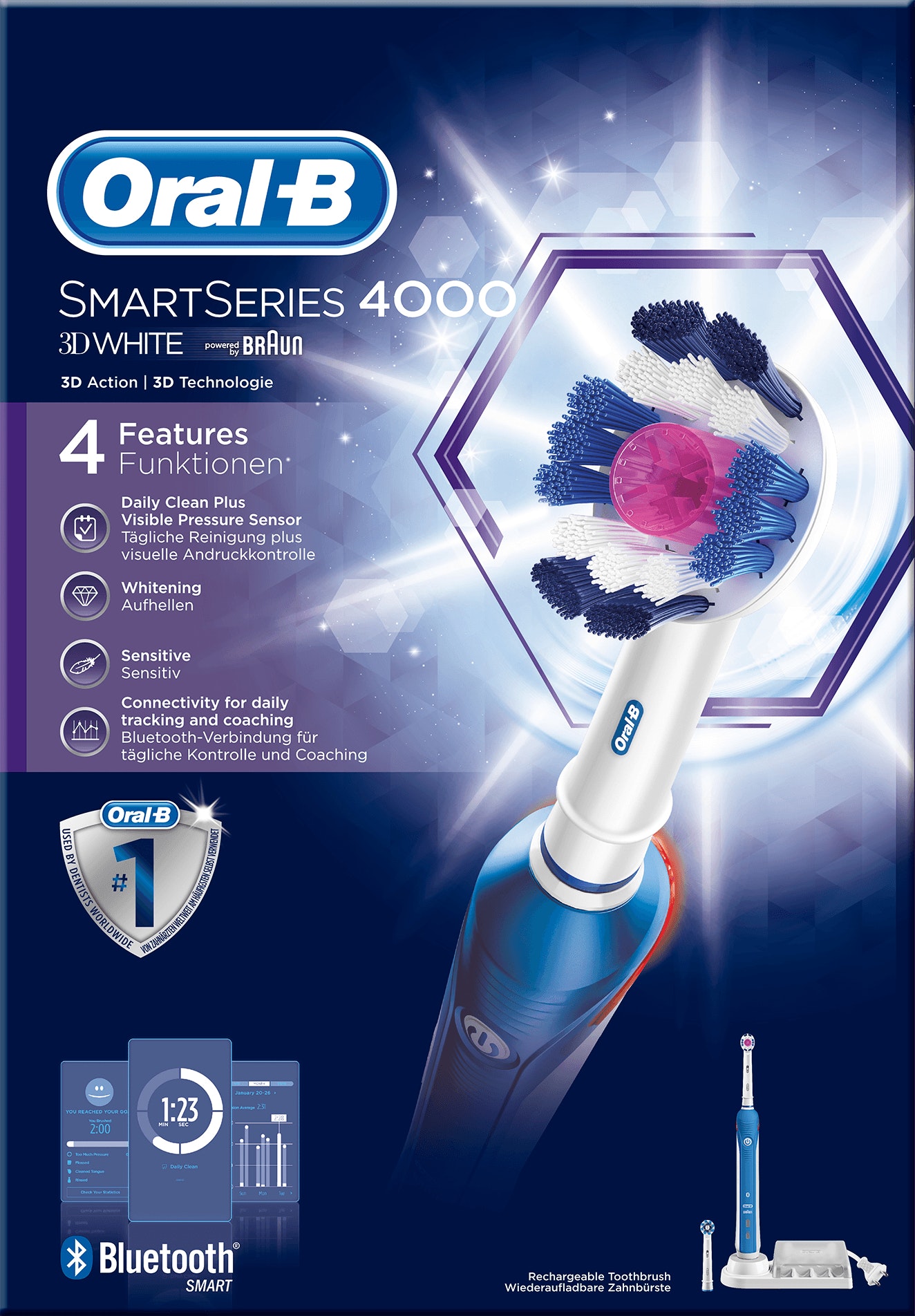 Oral-B 4000, PRO. Fuente de energía: Batería, Tipo de batería: Integrado. Peso: 360 g, Ancho del paquete: 100 mm, Profundidad del paquete: 178 mm. Número de empuñaduras incluidas: 1 pieza(s), Número de cabezales incluido: 2 pieza(s). Ancho de la caja principal: 31,7 cm, Longitud de la caja: 37 cm, Alto de la caja principal: 27,1 cm