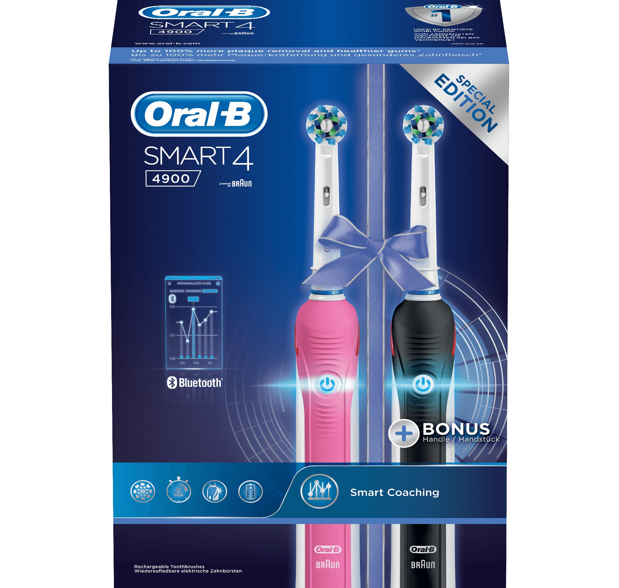 Oral-B Smart 4 4900 CrossAction. País de origen: Alemania. Fuente de energía: Batería, Tipo de batería: Integrado, Tecnología de batería: Ión de litio. Peso: 450 g, Ancho del paquete: 100 mm, Profundidad del paquete: 177 mm. Número de empuñaduras incluidas: 2 pieza(s), Número de cabezales incluido: 2 pieza(s). Ancho de la caja principal: 31,3 cm, Longitud de la caja: 36,4 cm, Alto de la caja principal: 26,5 cm