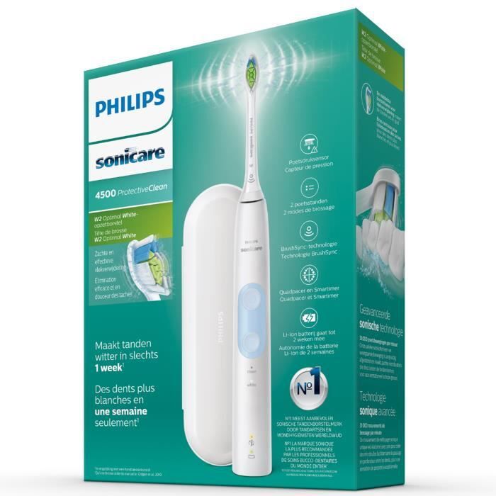 Philips Sonicare ProtectiveClean 4500 - White & Blue: dientes más blancos en 7 días - 2 modos (clean/white) - sensor de presión - indicador de cambio de cabezal de cepillo - Batería de 14 días de duración - Smartimer (temporizador de 2 minutos), Quadpacer y EasyStar
