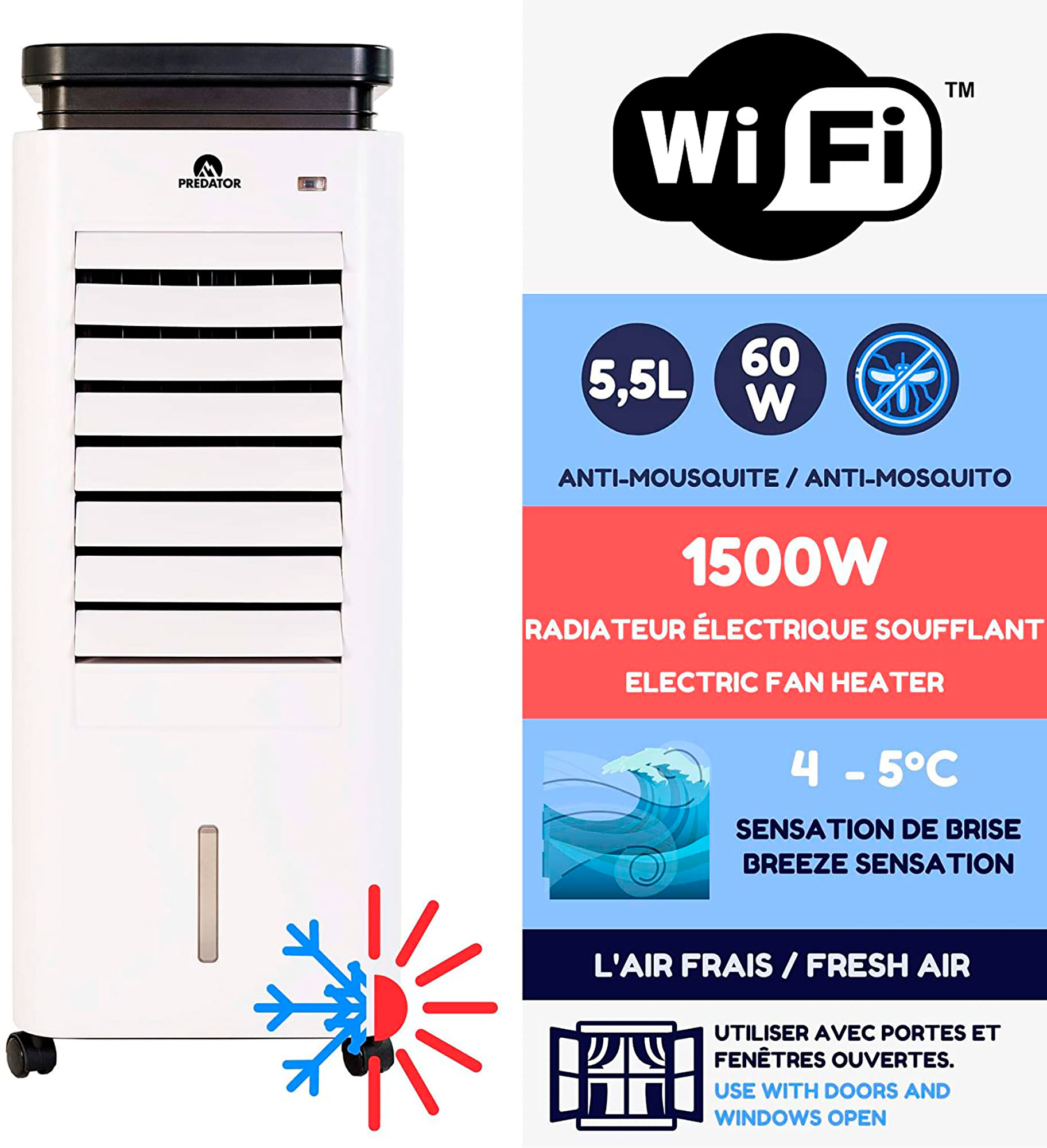 Consigue un ambiente confortable en cualquier estancia de tu casa con el climatizador evaporativo portátil Predator P20H, incluye función de aire caliente por lo que es perfecto para verano y para invierno.CARACTERÍSTICAS:Climatizador evaporativo 4 en 1: Ofrece 4 funciones en un solo aparato, función Cool Air que enfría el ambiente, función calor con una potencia de 1500W para utilizar en los días fríos, función Humidificador que aporta humedad, función Anti-insectos para que no te preocupes por las molestas picaduras.Alto Rendimiento: El sistema de enfriamiento por evaporación baja la temperatura ambiente. Dispone de un depósito de agua y hielo de 5,5 litros, al pasar por él, el aire se enfría y sale impulsado al exterior consiguiendo un efecto brisa refrescante. Es una alternativa más económica a los aires acondicionados.Control WIFI: Descárgate la app TuyaSmart y conéctate siguiendo las instrucciones para controlar el aparato con tu smartphone desde cualquier lugar. Incluye mando a distancia para controlar el climatizador desde la comodidad de tu cama o sofá, además dispone de panel táctil para ajustar el funcionamiento a tus necesidades.Máximo confort: El enfriador de aire se utiliza con las ventanas y puertas abiertas para que se alimente de aire nuevo, esto ayuda a una correcta ventilación de la estancia. Dispone de 3 velocidades para ajustar a tus necesidades en cada momento. Su asa y sus ruedas giratorias 360° facilitan el traslado de una habitación a otra de la casa con total comodidad.Silencioso: Su funcionamiento silencioso con un rango de 25db a 45db permite utilizarlo a cualquier hora del día, incluso mientras duermes, olvídate de molestos ruidos.Ahorra energía: El climatizador además de tener un diseño compacto y elegante dispone de una tecnología de eficiencia energética que ofrece un bajo consumo de electricidad en comparación con un aire acondicionado.ESPECIFICACIONES:4 Funciones:Enfría el aireCalefactorHumidificaAnti-mosquitosControl WIFIPanel TáctilMando a distanciaDepósito agua 5,5 LitrosEfecto brisaSilencioso: rango sonoro de 25db a 45dbAletas oscilantes vertical y horizontalmentePotencia 60W en modo Air CoolPotencia 1500W en modo Aire CalientePortátilRuedas giratorias 360° y asa para fácil transporte