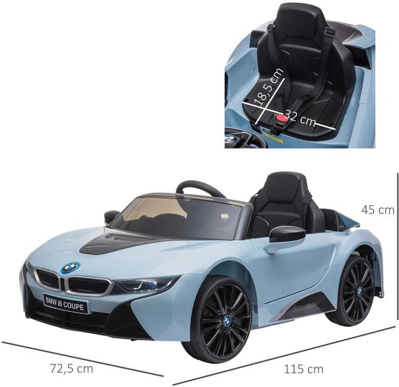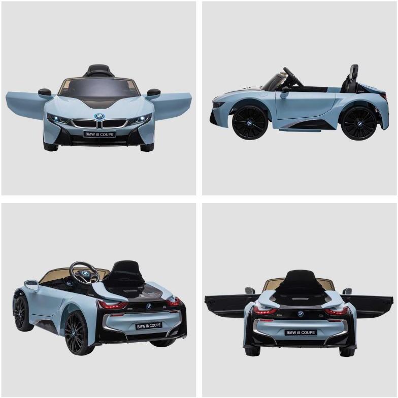Este coche eléctrico infantil BMW I8 COUPE con licencia de marca tiene detalles súper realistas. Es igual que el de verdad pero adaptado para que los peques de la casa se lo pasen en grande conduciéndolo. Sus 2 puertas permiten que los niños entren y salgan de él fácilmente. Sus faros y sonidos le dan un toque realista que divertirá mucho a los pequeños. ¡Disfruta más que nunca de los paseos en familia! Características - BMW I8 COUPE con licencia de la marca. Su aspecto realista, la bocina, la música, los faros brillantes, su diseño aerodinámico y sus 2 puertas encantará a toda la familia - Neumáticos anchos, cinturón de seguridad y amortiguador de ruedas posteriores para una conducción segura y suave - Se puede dirigir de 2 modos, conduciéndolo manualmente o mediante el control remoto - Su mando a distancia es muy fácil de usar, sólo debes presionar los botones para avanzar o retroceder, y girar a izquierda o derecha - Ranura para tarjeta TF, disponible en formato MP3 - Adecuado para mayores de 3 años de edad con un peso máximo de 30 kg (bajo supervisión de un adulto) - Tiempo de carga: 8-12 horas. Autonomía máxima de la batería: 1 hora - Certificación: EN71-1.2.3, EN62115, EMC Especificaciones - Color: azul - Material: PP, metal - Medidas totales: 115x72,5x46 cm (LxANxAL) - Medidas del asiento: 32x18,5 cm (LxAN) - Medidas del neumático: ?21x6,5 cm (Diam.xAN) - Batería: 6V 7AH - Velocidad: 3 km/h - Especificaciones del cargador: 6V, 1000MA - Soporta un peso máximo de 30 kg - Edad recomendada: mayores de 3 años - Autonomía máxima de la batería: 1 hora - Tiempo de carga: 8-12 horas - Certificación: EN71-1.2.3, EN62115, EMC - Referencia: 370-118V90