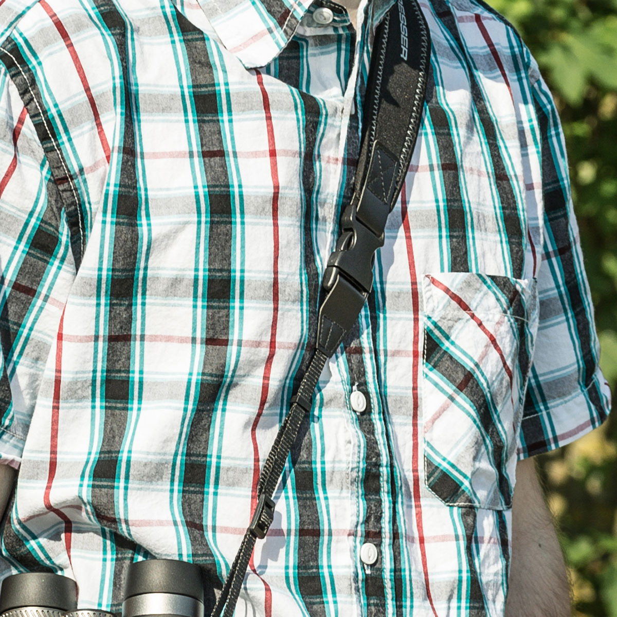 Correa de neopreno reforzada para enganchar directamente a las hebillas laterales y clips para enganchar y desenganchar fácilmente. Superficie antideslizante para evitar roces en el cuello y caidas.