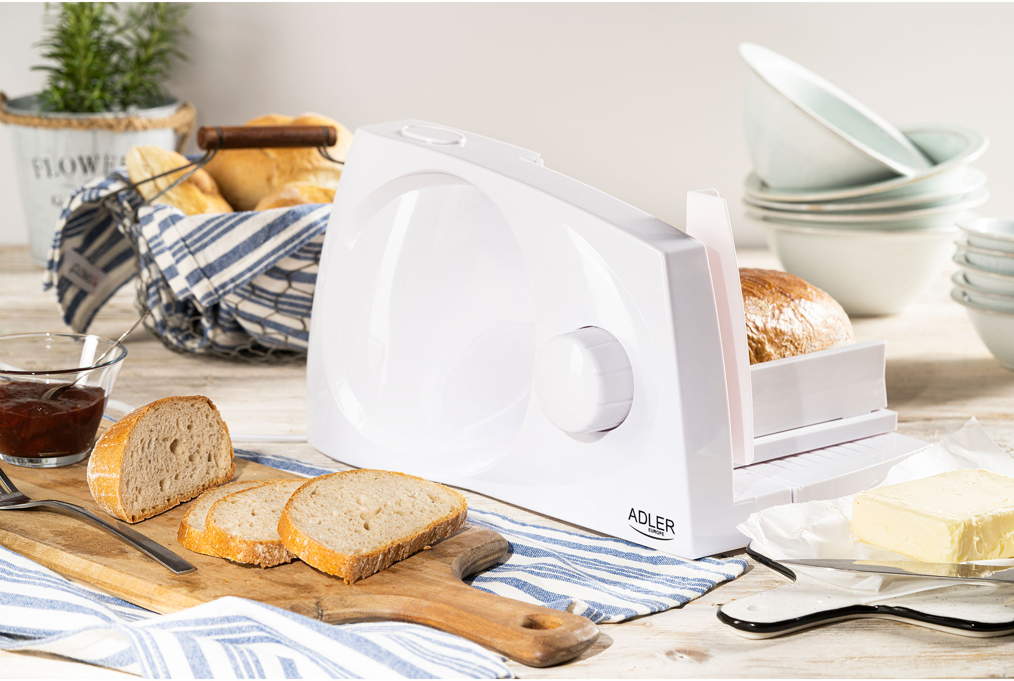 Prepara ricas meriendas, snacks o desayunos con el cortafiambres - rebanador de pan de Adler.CARACTERÍSTICAS:Plegable: Rebanadora de alimentos compacta, segura y fácil de usar. Es plegable por lo que es fácil de transportar y ocupa poco espacio.Espesor de corte ajustable: Puedes elegir el grosor de corte de 0 a 15 mm mediante el selector.Versátil: El cortafiambres te permite cortar en lonchas todo tipo de carne, fiambres, queso, verduras, pan y otros alimentos.Calidad: Disco cortador de acero inoxidable de gran calidad y duradero con un diámetro de 170 mm. El aparato tiene una potencia máxima de 400W.Seguridad: La máquina está equipada con un prensador de productos que protege tus dedos durante el corte y un dispositivo de seguridad para evitar la puesta en marcha accidental. Tiene pies con ventosas para garantizar la estabilidad.Fácil limpieza: El disco de corte, el alimentador a presión y las guías son desmontables para facilitar su limpieza.ESPECIFICACIONES:Potencia: 150WPotencia máxima: 400 WHoja de acero inoxidable de 170 mm.Espesor de corte suave ajustable 0-15 mmDiseño plegableComida empujada con protector de pulgar de seguridadPatas de gomaCuchilla extraíbleDiseño de almacenamiento de cablesColor blancoLongitud del cable de alimentación: 105 cmMaterial del cuerpo: PlásticoDimensiones del dispositivo: 44,1x24,5x21,6 cm