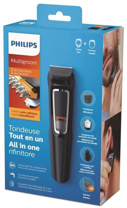 Recortadora multiestilo PHILIPS MG3740/15 - Barba y cabello - Negro - Cuchillas de acero autoafilables - Hasta 60 min de autonomía - Accesorios enjuagables - 9 herramientas para rostro y cabello - Estuche para fácil almacenamiento y transporte.